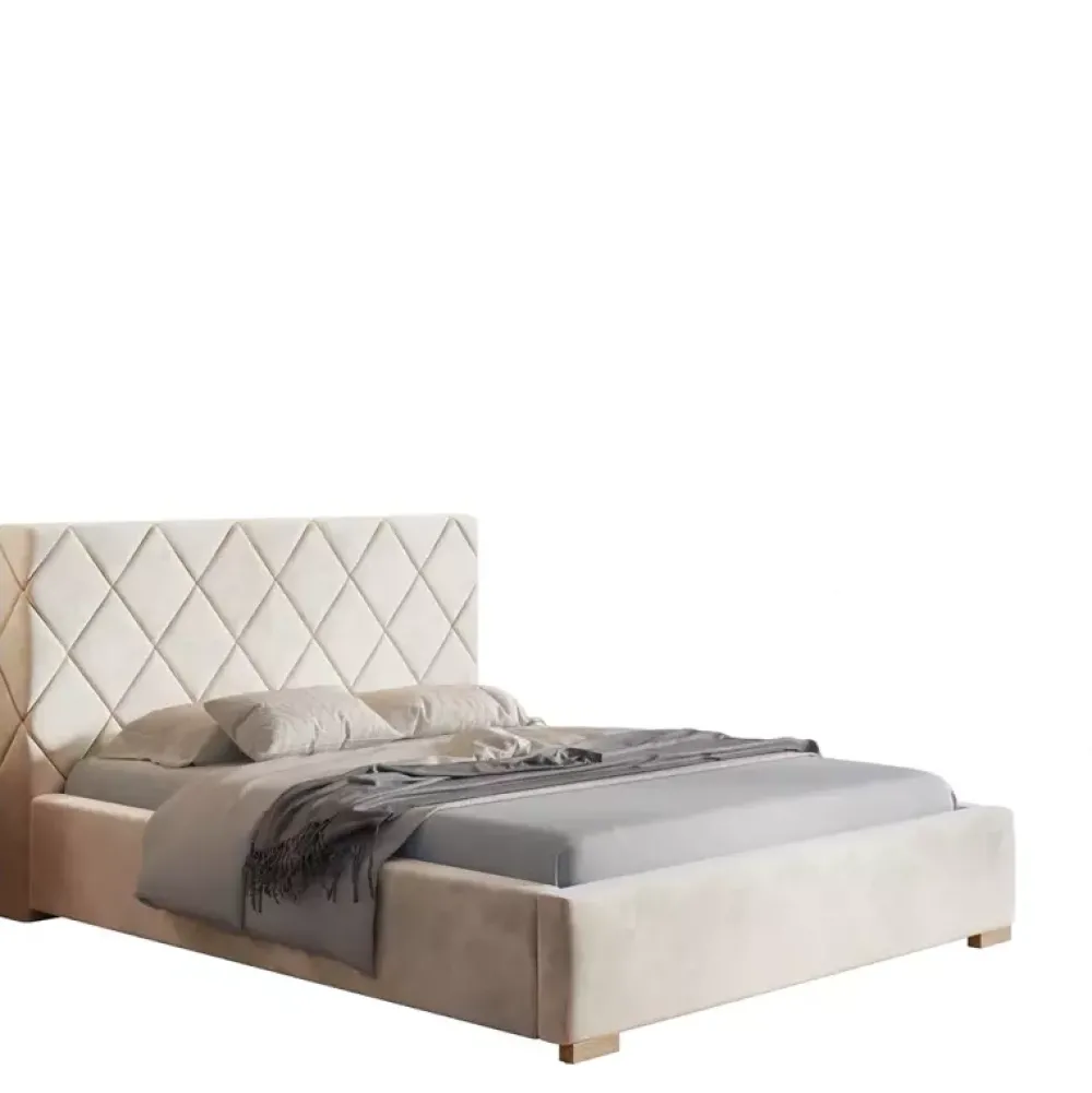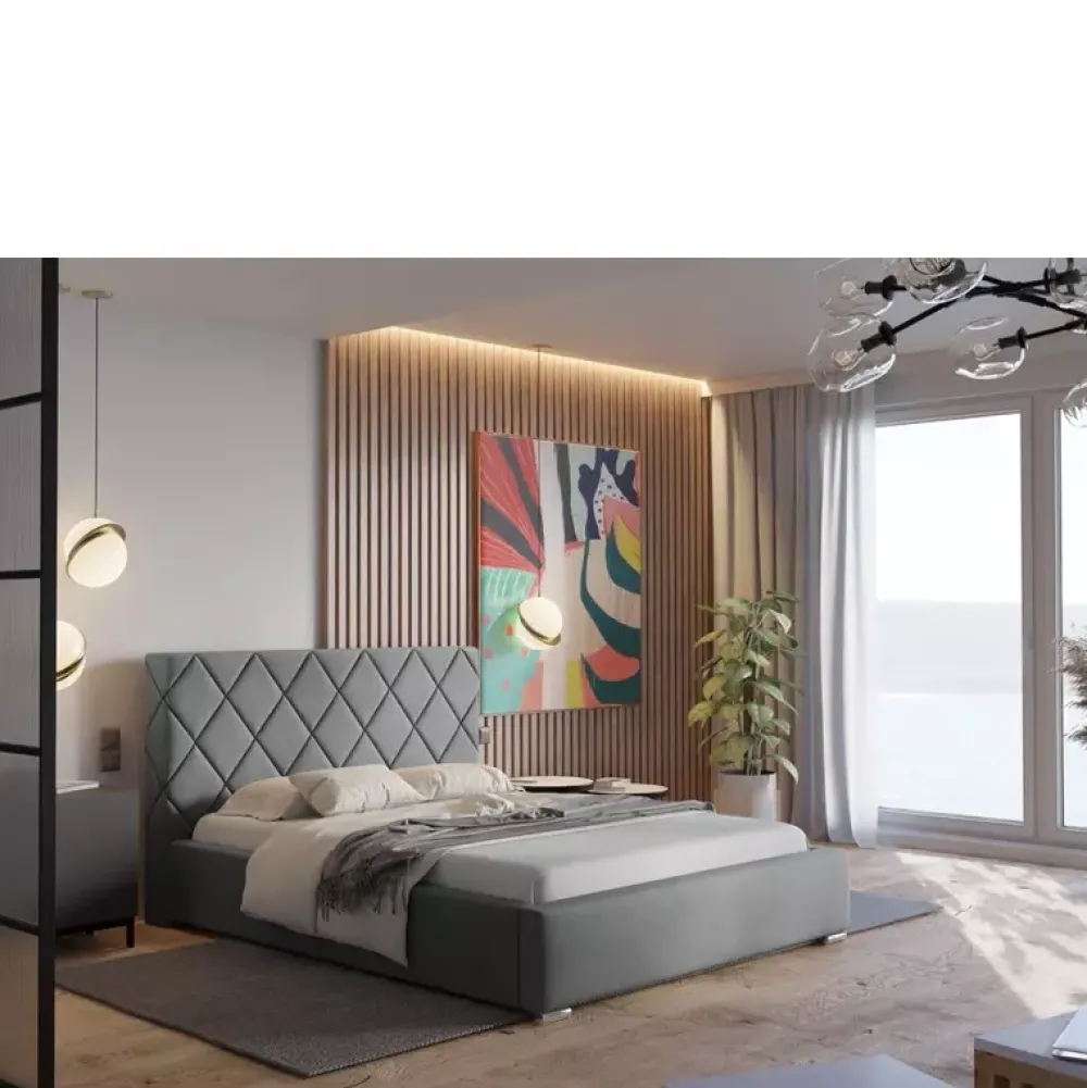 - Łóżko z oparciem o wysokości 104 cm ozdobionym eleganckim wzorem caro na całej powierzchni. W konfiguratorze poza bogatą ofertą tkanin znajdą państwo także możliwość zmiany stelaża, wybór koloru nóżek, czy kolor obicia pleców oparcia.
