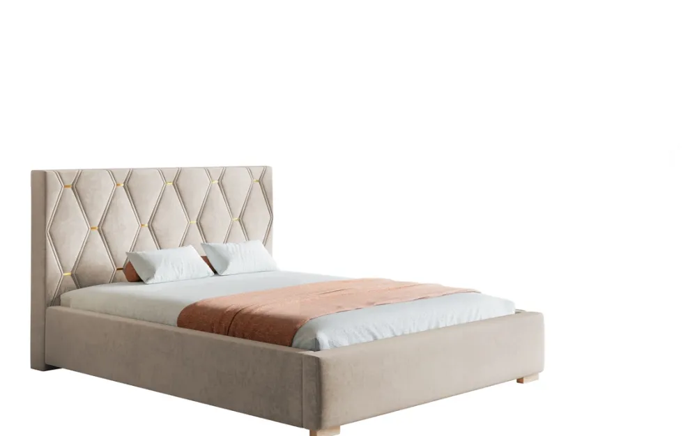 - Łóżko tapicerowane 120×200 cm HAPPE zostało wyposażone w stelaż składający się z 32 brzozowych listew, pod którym znajduje się pojemnik na pościel. Łóżko posiada możliwość personalizacji koloru oraz rodzaju tkaniny, wysokości zagłówka oraz koloru nóżek.