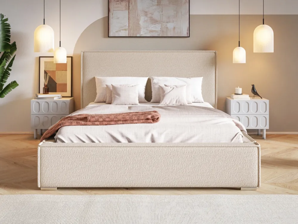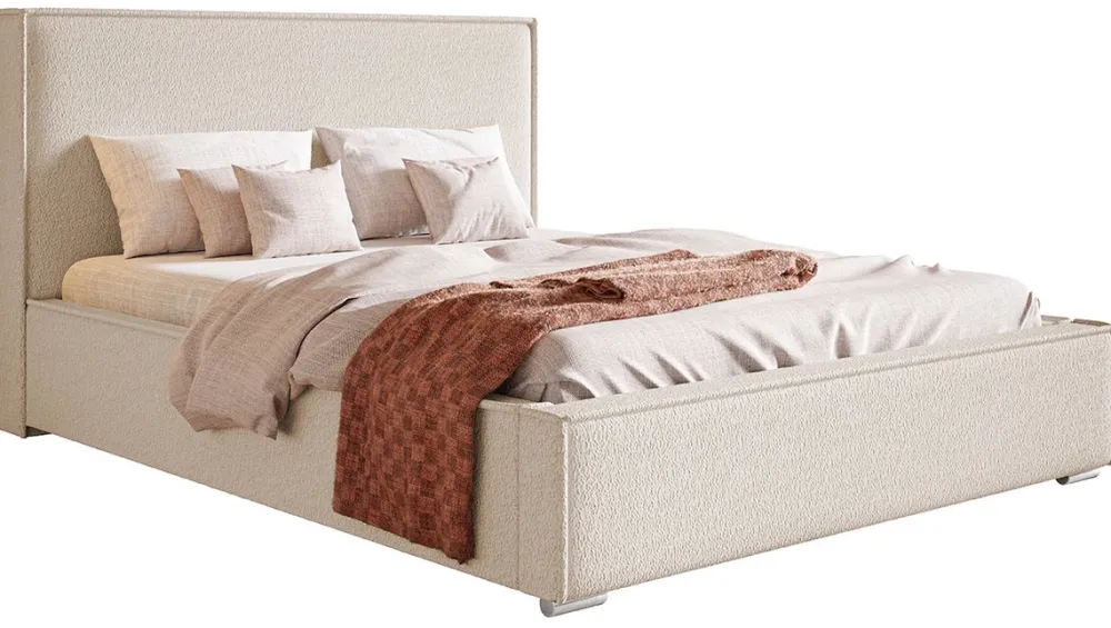 - Klasyczne łóżko do sypialni z wysokim tapicerowanym oparciem. Pozbawione zdobień, prosta forma bez pikowań i przeszyć. W konfiguratorze znajduje się opcja wyboru tkaniny, zmiana wysokości oparcia, wybór nóżek, zmiana stelaża z drewnianego na metalowy.