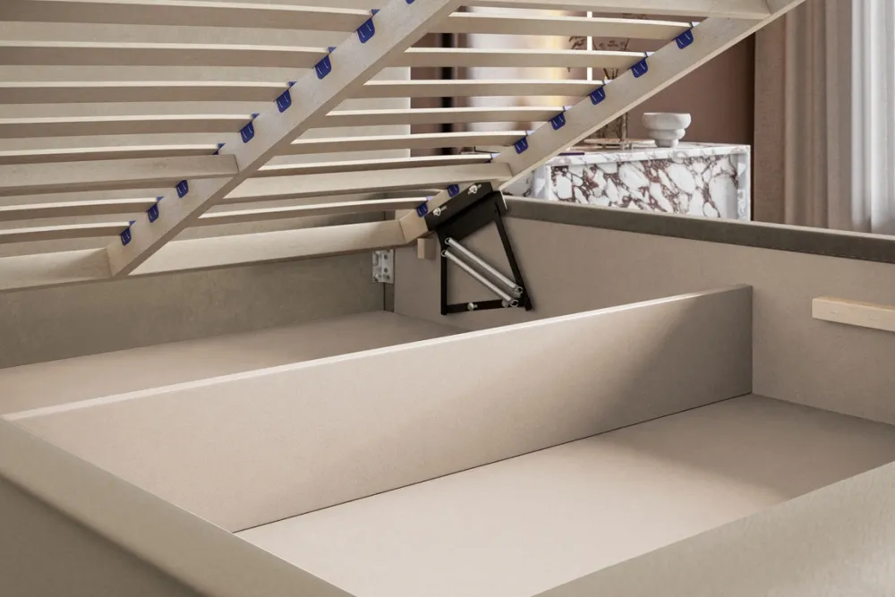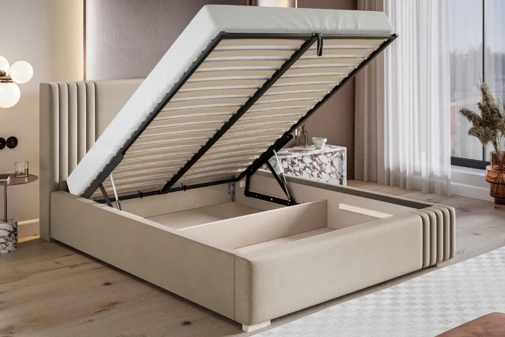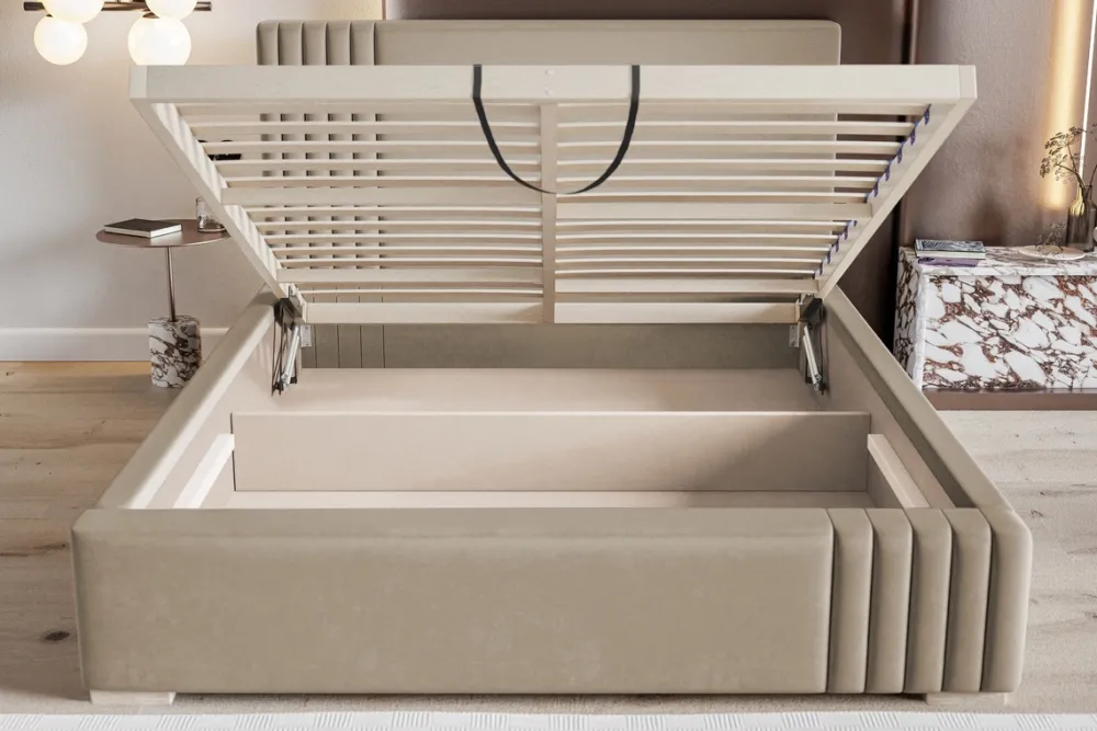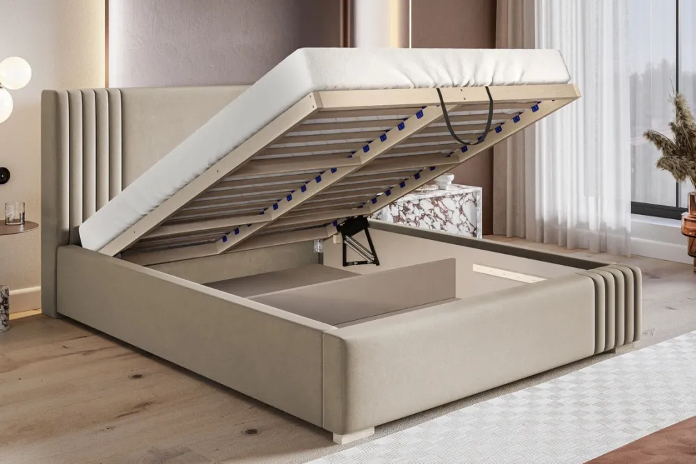 Wnętrze łóżka skrywa praktyczny pojemnik na pościel, który jest nieoceniony w utrzymaniu porządku. Umożliwia on łatwe przechowywanie dodatkowych kołder, poduszek czy pościeli. To rozwiązanie jest szczególnie cenione w mniejszych mieszkaniach, gdzie każdy centymetr ma znaczenie.