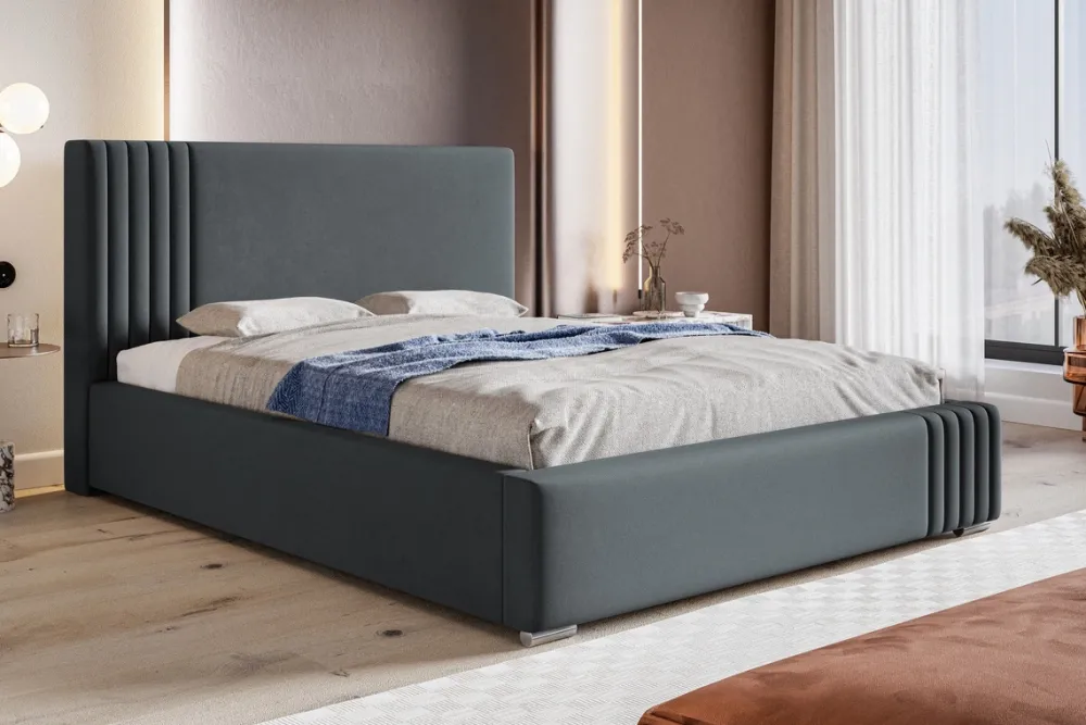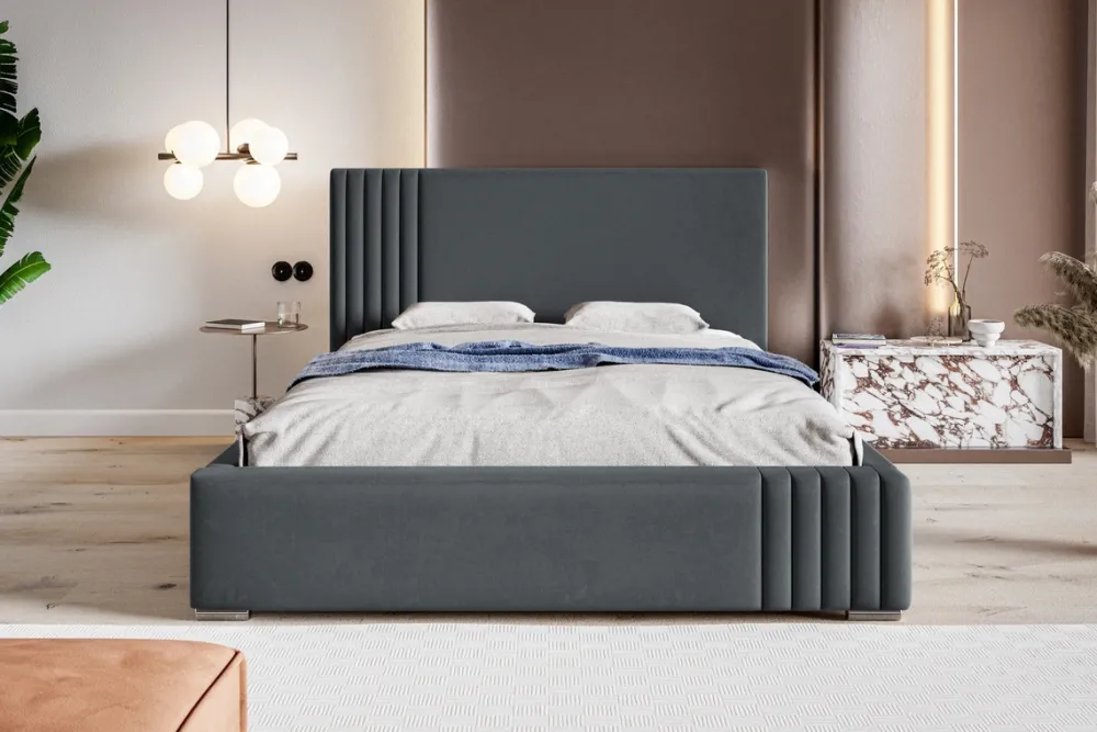 Zagłówek jest jednym z wyróżniających się elementów tego łóżka do sypialni. Przeszyty ozdobnym wzorem nie tylko dodaje estetyki, ale również zapewnia wygodne oparcie podczas czytania czy oglądania telewizji w łóżku.