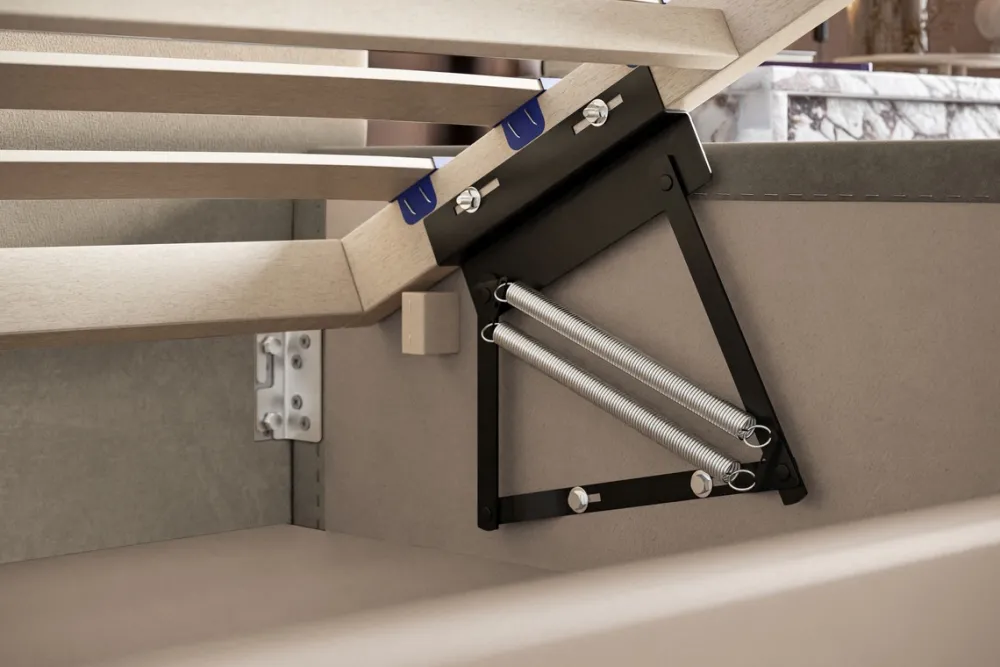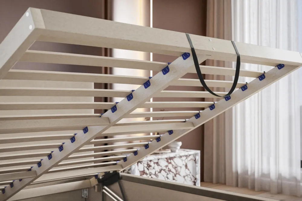 - Łóżko w standardzie wyposażone jest w drewniany stelaż składający się z 32 brzozowych sprężynujących listew. Stelaż podnoszony jest na podnośnikach sprężynowych. Rama stelaża wykonana jest ze sklejki. Rączka do podnoszenia wykonana jest w losowym kolorze, element niewidoczny po nałożeniu materaca. Poszczególne listewki oddalone są od siebie o około 5-5,5 cm. Maksymalne obciążenie stelaża to 200kg.