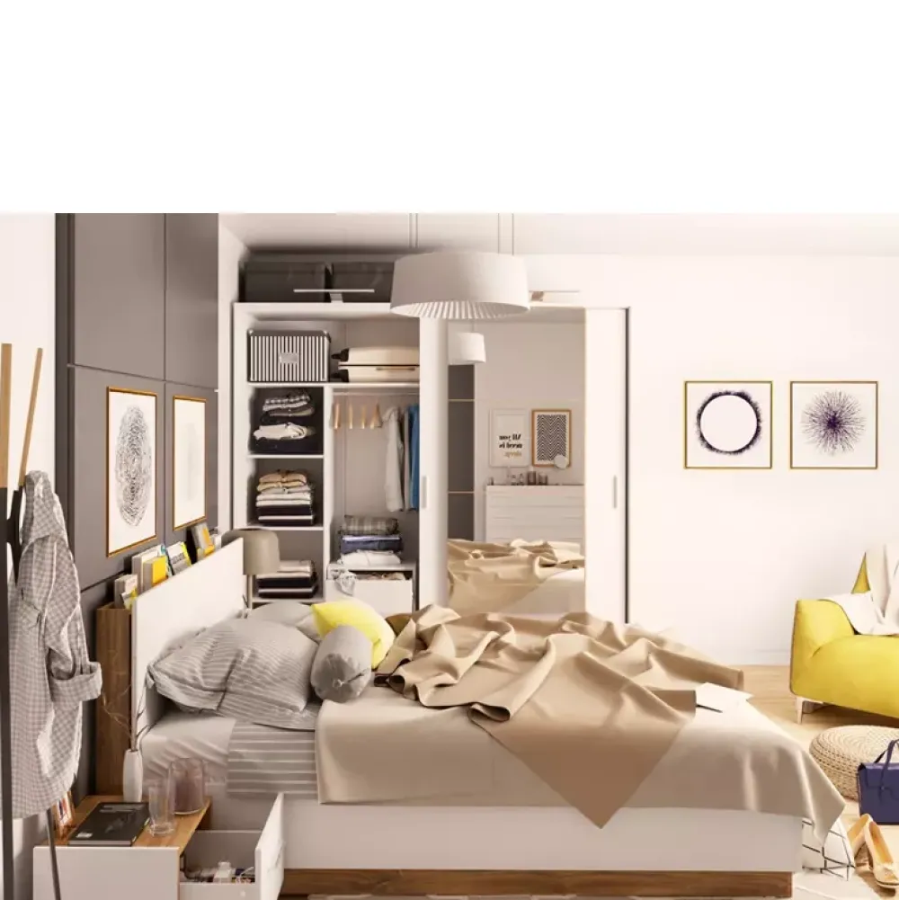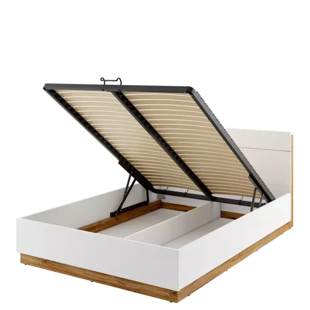 Łóżko do sypialni 160×200 cm DENTRO zostało wyposażone w stelaż szczebelkowy z metalową ramą osadzony na podnośnikach gazowych, które pozwalają na komfortowy dostęp do umieszczonych w nim pościeli oraz akcesoriów.