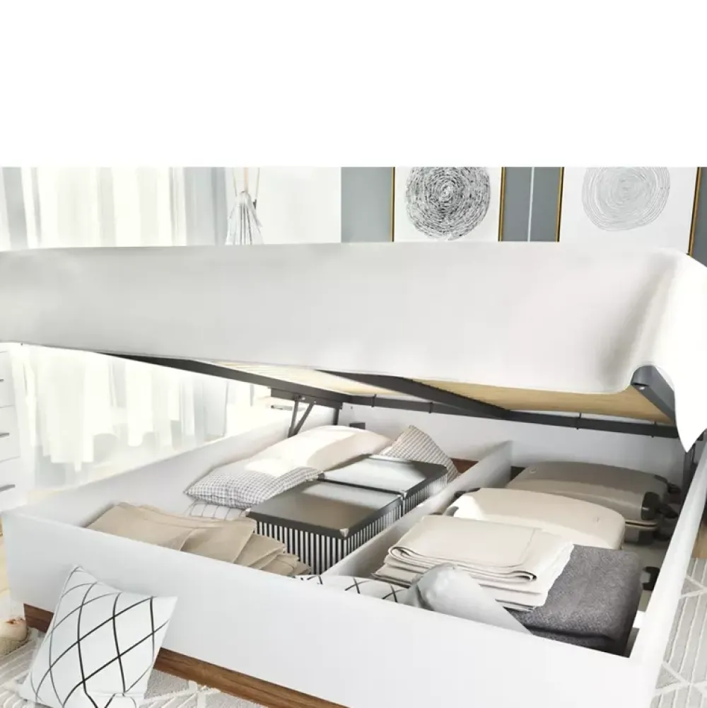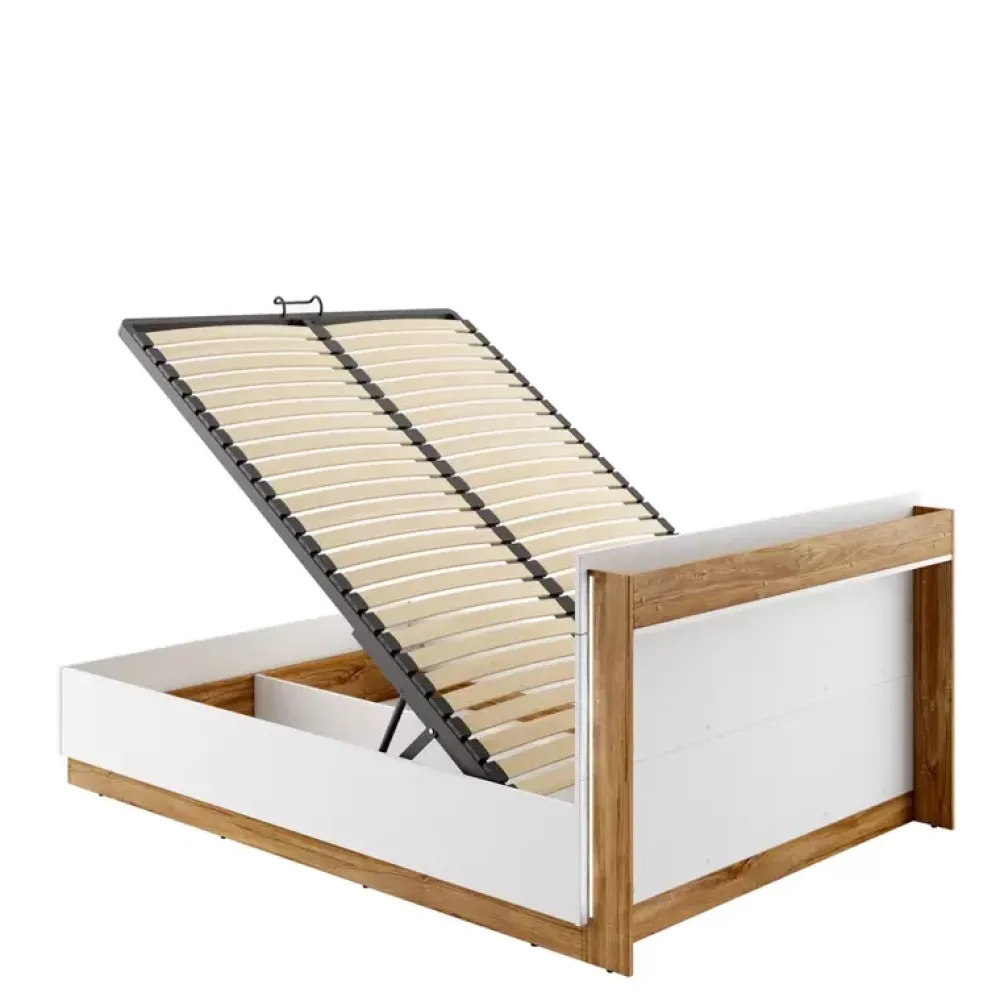 - Łóżko posiada stelaż szczebelkowy z metalową ramą oraz podnośnikami gazowymi pod którym znajduje się pojemnik na pościel.