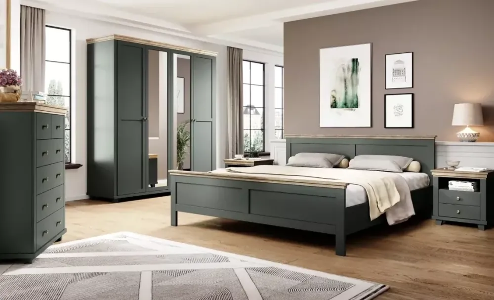 Sypialnia IVORIA to kolekcja mebli o klasycznej stylistyce. Dostępne w kolorze butelkowej zieleni w połączeniu z dębem Lefkas, idealnie wpasowuje się w dzisiejsze trendy. Dla zwolenników bardziej prowansalskich wystrojów meble dostępne są w kolorze jesion Abisko, który jest jasnym odcieniem o charakterystycznym szarym usłojeniu. Dostępne w kolekcji bryły takie jak łoże, stoliki nocne, komody i pojemne szafy pozwolą zaaranżować wymarzoną sypialnię o wyjątkowym stylu.