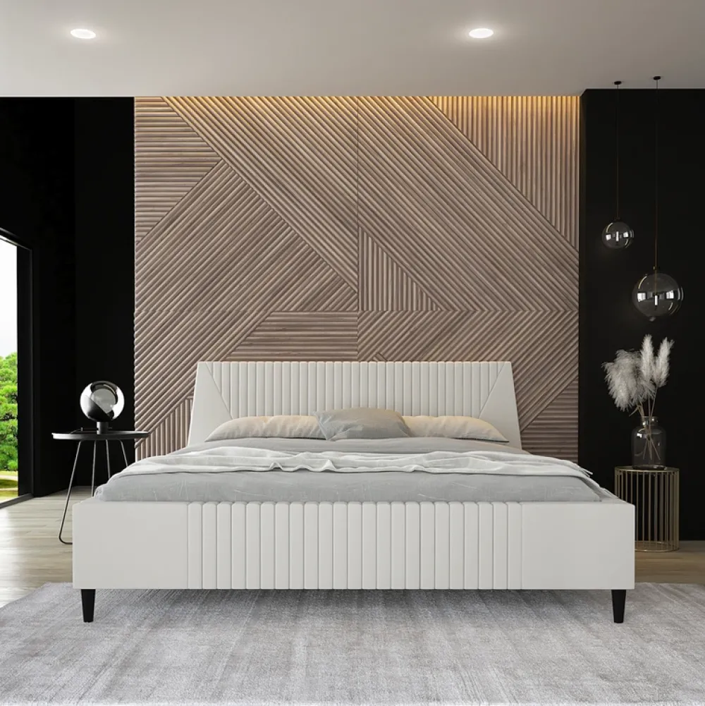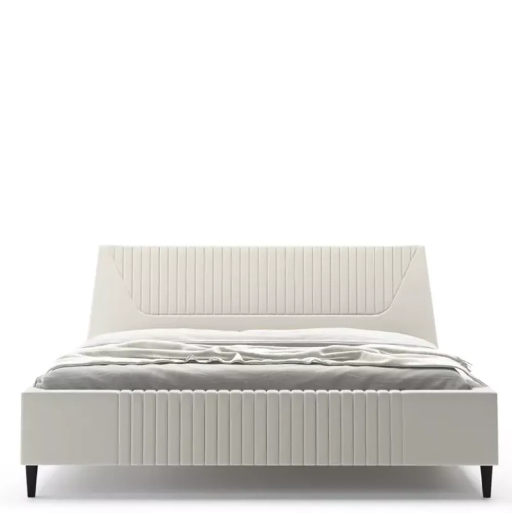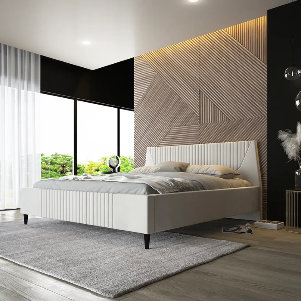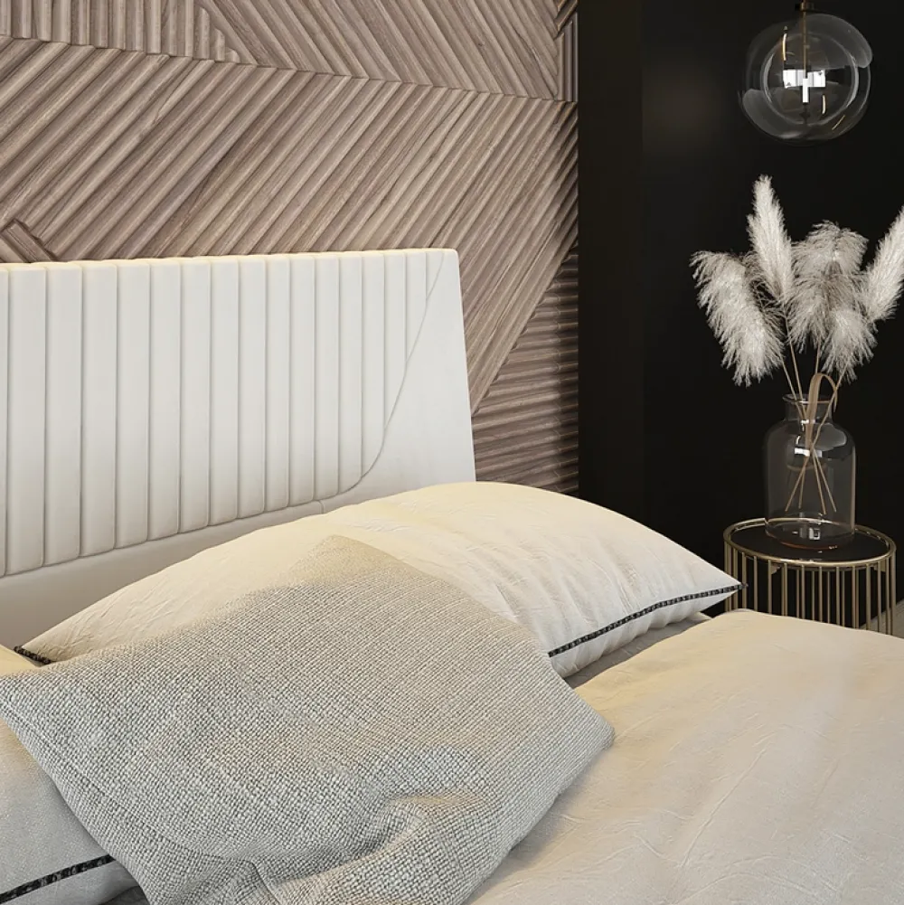 - Miękki tapicerowany zagłówek z pojedynczym poziomym wciągiem nadającym intrygującego charakteru.