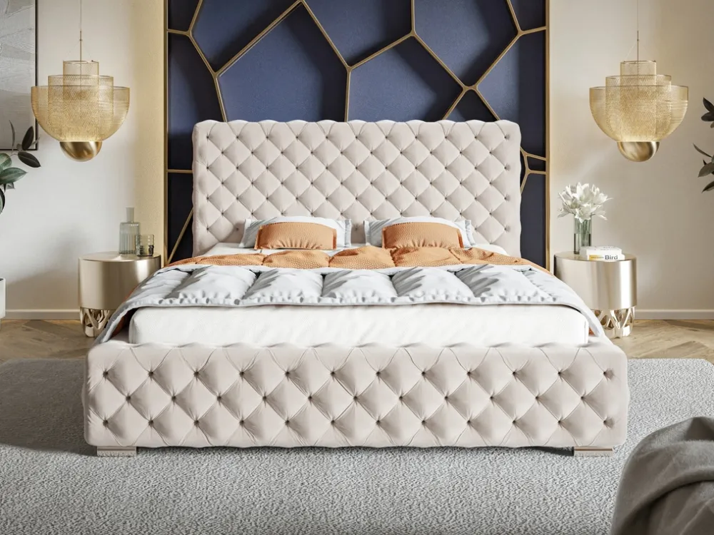 - Wygodne łoże do sypialni z pikowanym zagłówkiem i korpusem o powierzchni spania 160×200 cm. Wysokość zagłówka modyfikować w konfiguratorze, podobnie jak rodzaj stelaża, obicie oparcia, czy kolor nóżek.