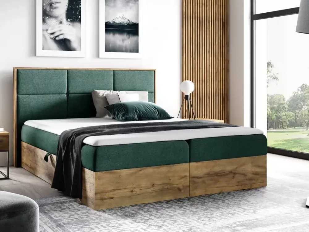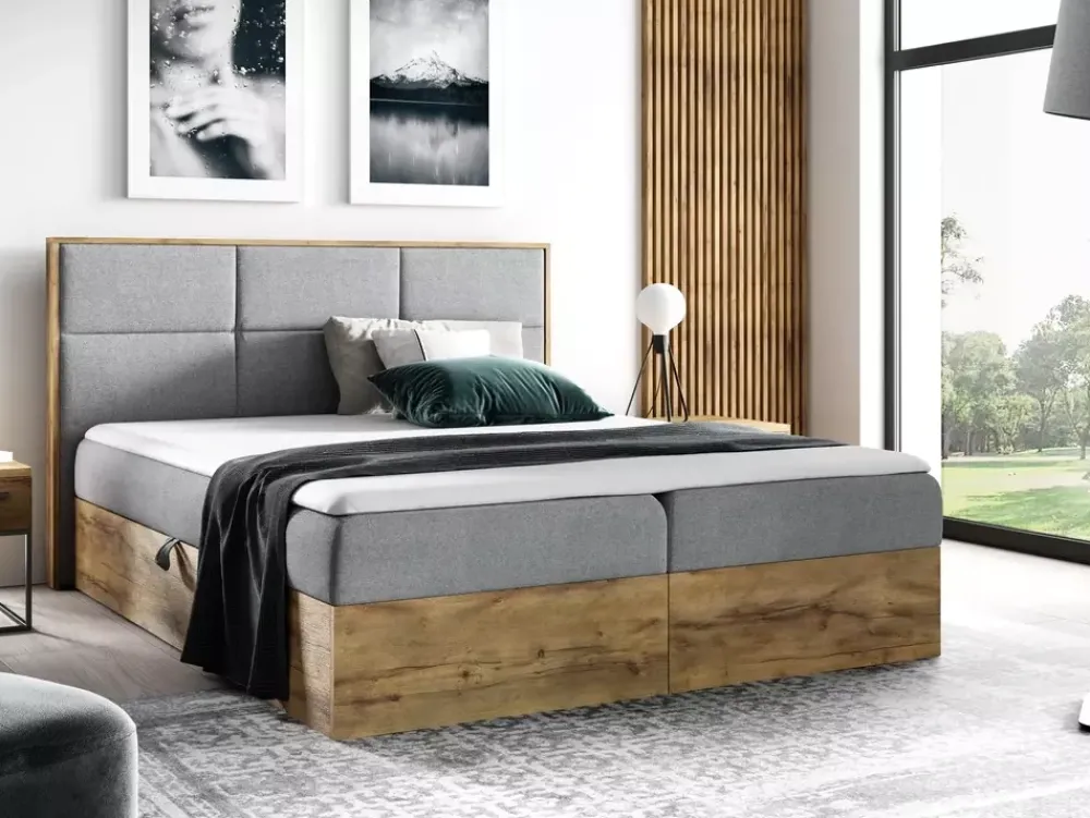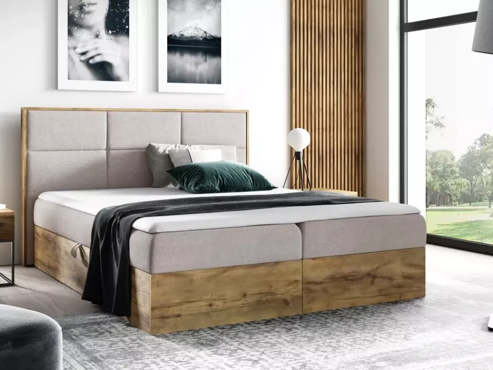 Szczególną uwagę przyciąga eleganckie zagłówki, zdobione tapicerowanymi przeszyciami w kształcie prostokątów. Ten subtelny detal dodaje łóżku głębi i charakteru, podkreślając jego nowoczesny styl.