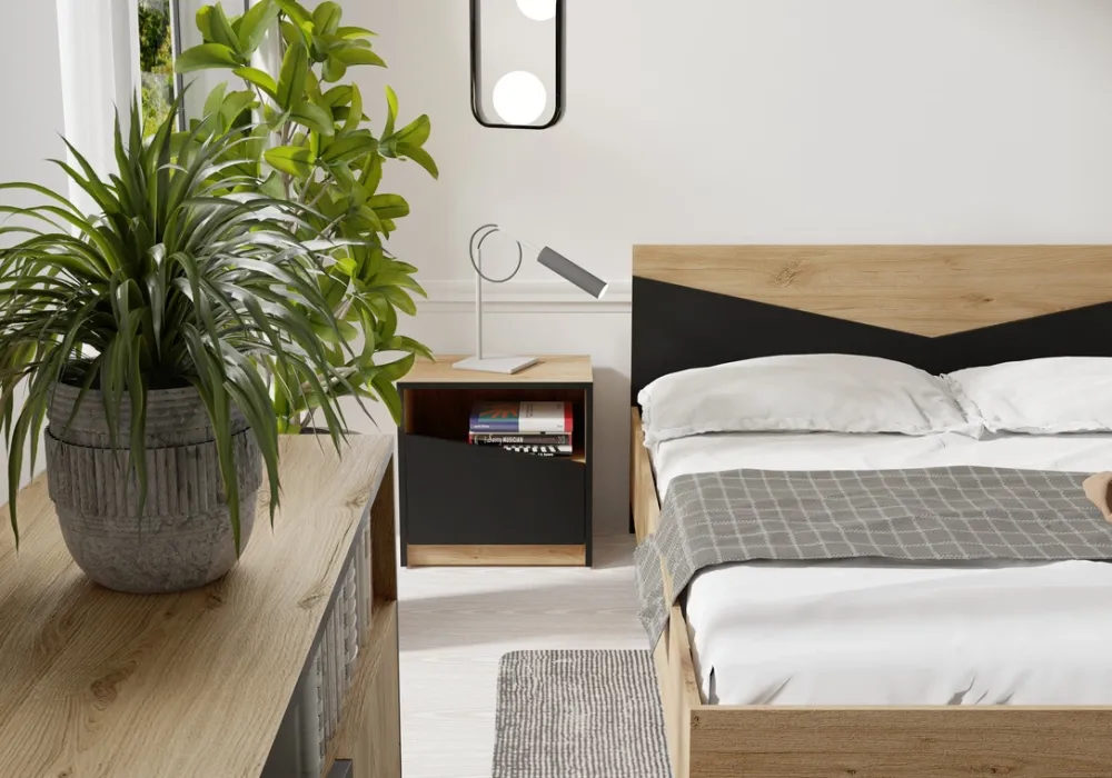 - Dąb Odwieczny + Czarny: Klasyczne połączenie, które wprowadza do sypialni elegancję i nowoczesny charakter. Ciemne akcenty idealnie komponują się z naturalnym odcieniem drewna, tworząc harmonijną całość.