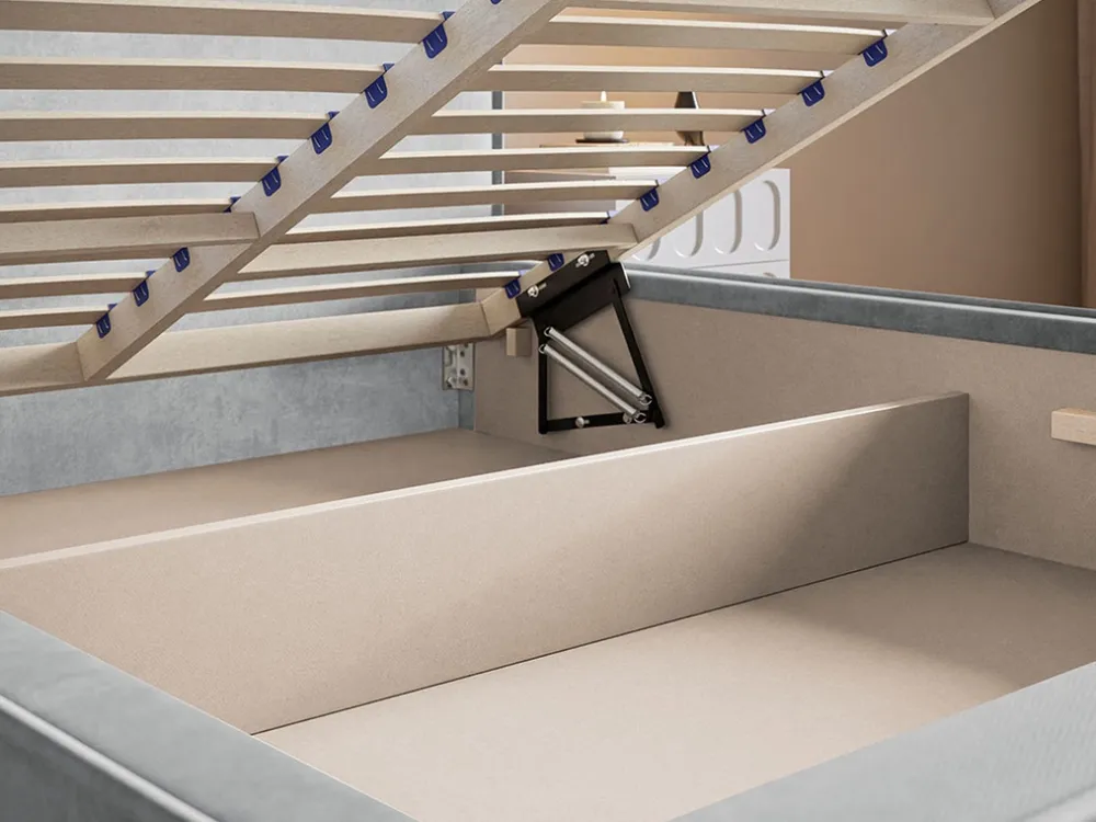 - Opcjonalnie stelaż drewniany za dopłata zmienić można na wersję z ramą wykonaną z metalu, podnoszoną na siłownikach gazowych. W tej wersji stelaż składa się z 36 brzozowych listew sprężynujących. Uchwyt służący do podnoszenia stelaża w kolorze losowym, element niewidoczny. Obciążenie maksymalne to 200 kg.