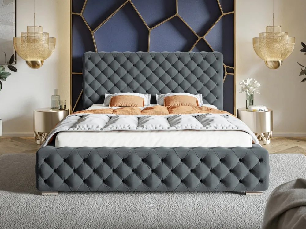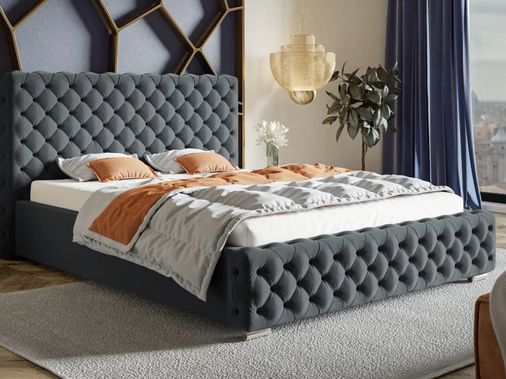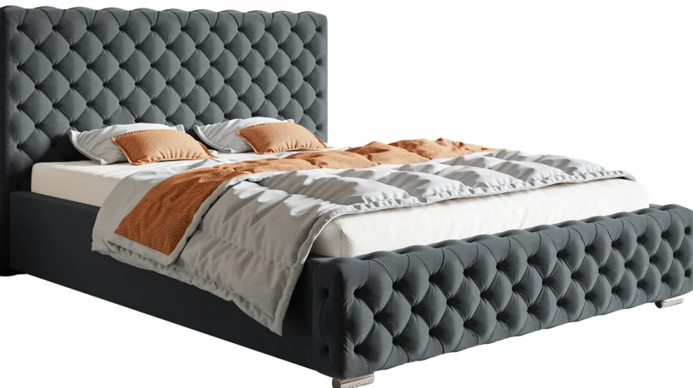 - Wygodne łoże do sypialni z pikowanym zagłówkiem i korpusem o powierzchni spania 140×200 cm. Wysokość zagłówka modyfikować w konfiguratorze, podobnie jak rodzaj stelaża, obicie oparcia, czy kolor nóżek.