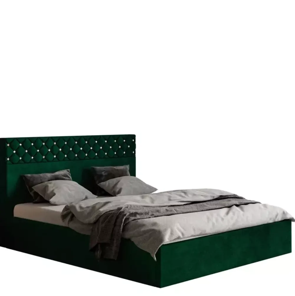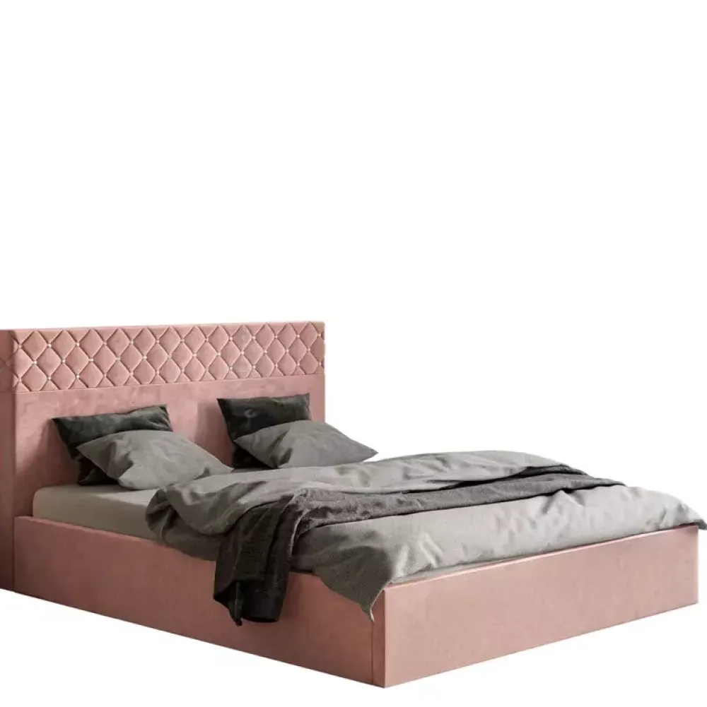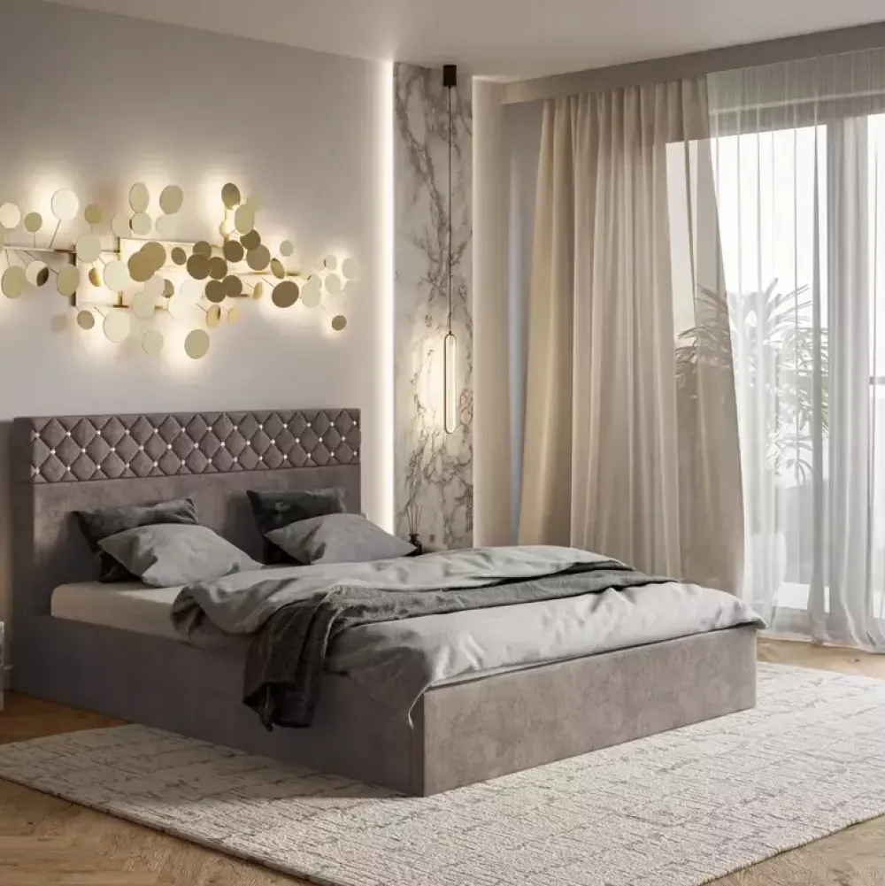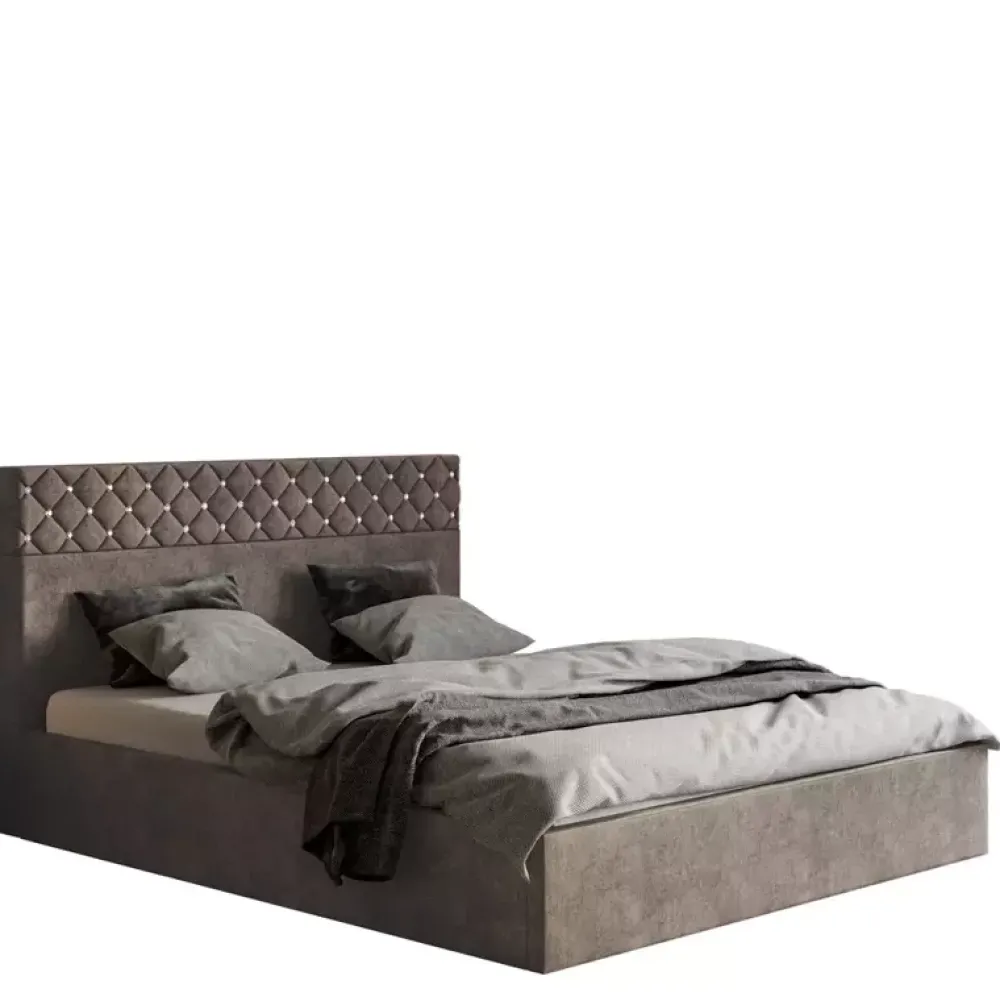 - Łóżko wyposażone w wysoki zagłówek tapicerowany, solidny stelaż, który w konfiguratorze można wymienić na metalowy unoszony na podnośnikach gazowych. Dostępne w kilkudziesięciu wariantach kolorystycznych tkanin tapicerskich różnych gatunków.