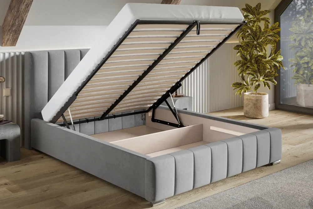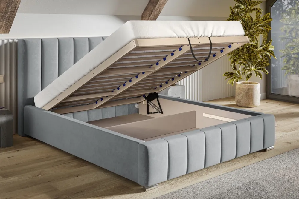 - Opcjonalnie stelaż drewniany za dopłata zmienić można na wersję z ramą wykonaną z metalu, podnoszoną na siłownikach gazowych. W tej wersji stelaż składa się z 36 brzozowych listew sprężynujących. Uchwyt służący do podnoszenia stelaża w kolorze losowym, element niewidoczny. Obciążenie maksymalne to 200 kg.