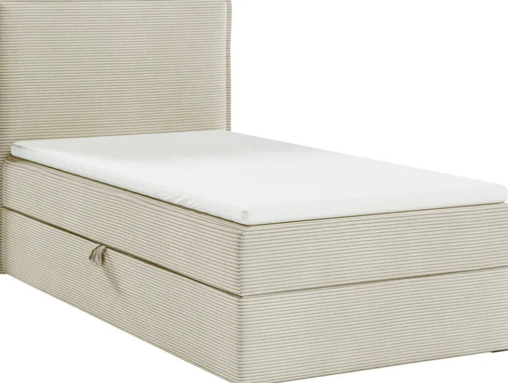 - Łóżko zostało wykończone tkaniną sztruksową Poso, która charakteryzuje się delikatną, prążkową fakturą. Sztruks ten jest nie tylko wyjątkowo przyjemny w dotyku, ale również niezwykle wytrzymały, co pozwala na zachowanie estetycznego wyglądu łóżka przez wiele lat.