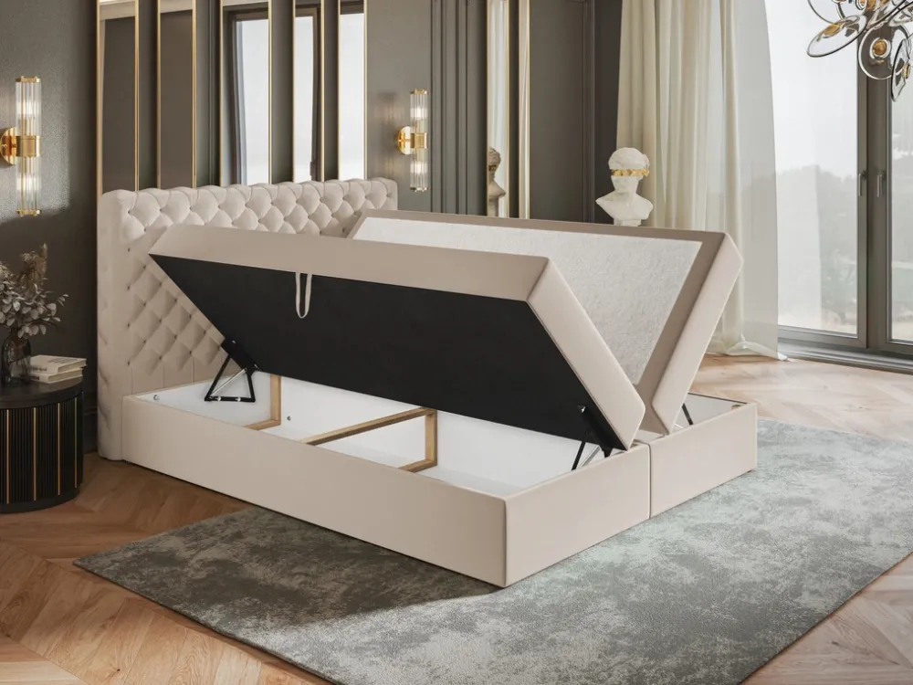 - Łóżko posiada pojemnik na pościel o wysokości 26 cm podzielony na dwie części, którego rozkładanie jest wspomagane za pomocą automatu sprężynowego.