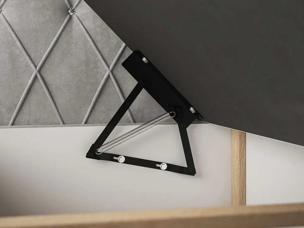 - Łóżko posiada pojemnik na pościel o wysokości 26 cm podzielony na dwie części, którego rozkładanie jest wspomagane za pomocą automatu sprężynowego.