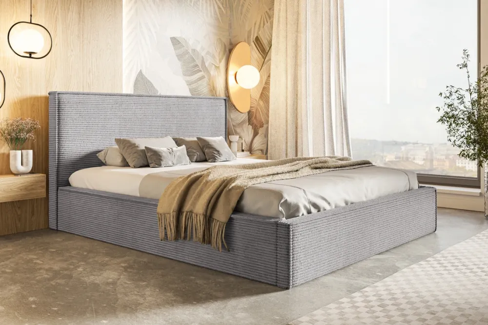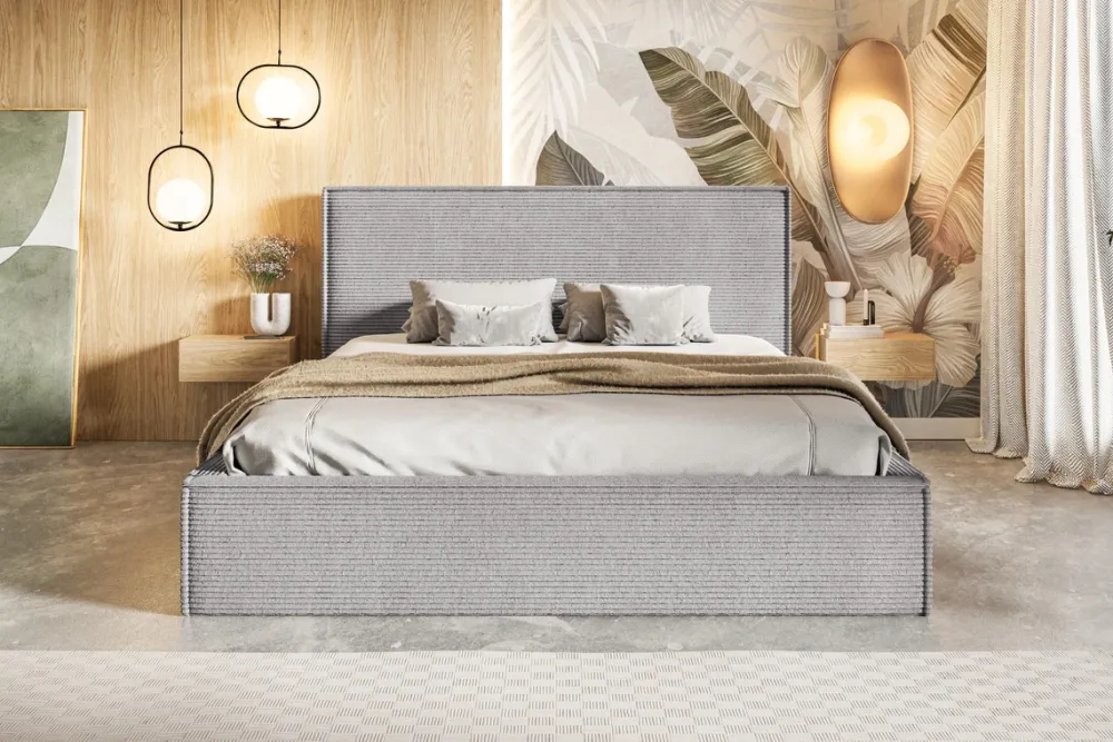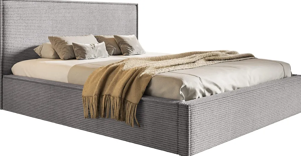 - Łóżko tapicerowane PARISIO o powierzchni spania 160×200 cm obite zostało wysokiej jakości tkaniną sztruksową Poso. Łóżko posiada pojemnik na pościel otwierany za pomocą podnośników, które przejmują na siebie ciężar i odciążają otwieranie.