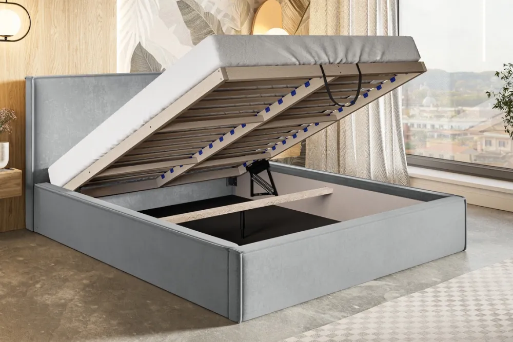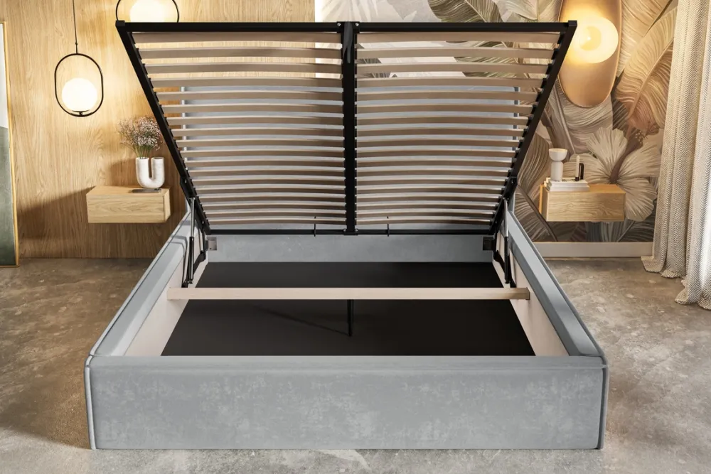 Tapicerowane łóżko 160×200 cm wyposażono w pojemny schowek na pościel, który pomoże utrzymać porządek w Twojej sypialni. Dzięki automatom ułatwiającym dostęp do pojemnika codzienne korzystanie jest niezwykle wygodne i intuicyjne. To idealne rozwiązanie dla tych, którzy cenią praktyczność i estetykę w jednym.