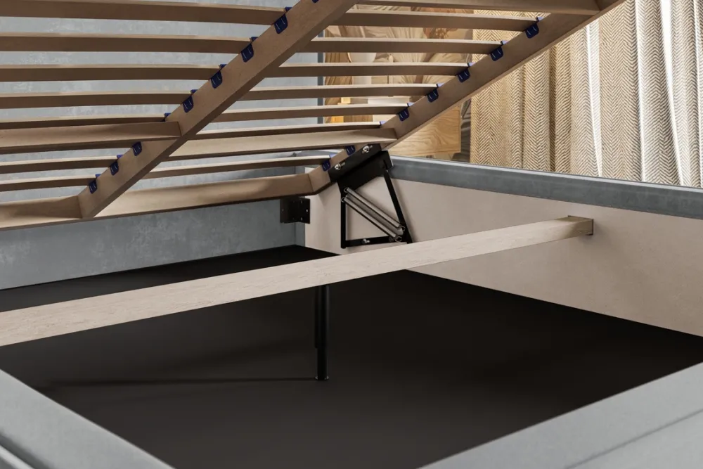 - Opcjonalnie stelaż drewniany za dopłata zmienić można na wersję z ramą wykonaną z metalu, podnoszoną na siłownikach gazowych. W tej wersji stelaż składa się z 36 brzozowych listew sprężynujących. Uchwyt służący do podnoszenia stelaża w kolorze losowym, element niewidoczny. Obciążenie maksymalne to 200 kg.