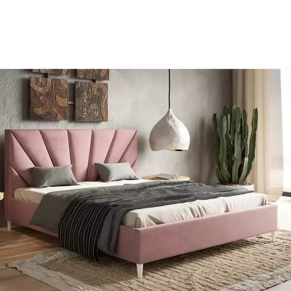 - Łóżko sypialniane z wysokim tapicerowanym zagłówkiem, udekorowane wzorem przypominającym muszlę. Cała konstrukcja unosi się na wysokich 13 cm nogach wykonanych z drewna dostępnych w trzech wariantach kolorystycznych.