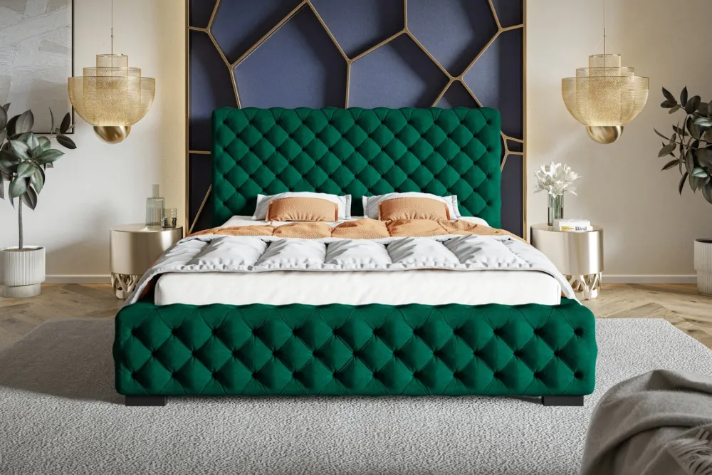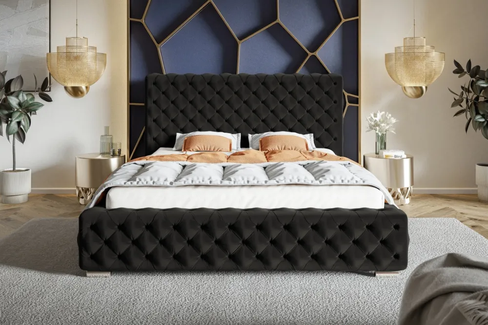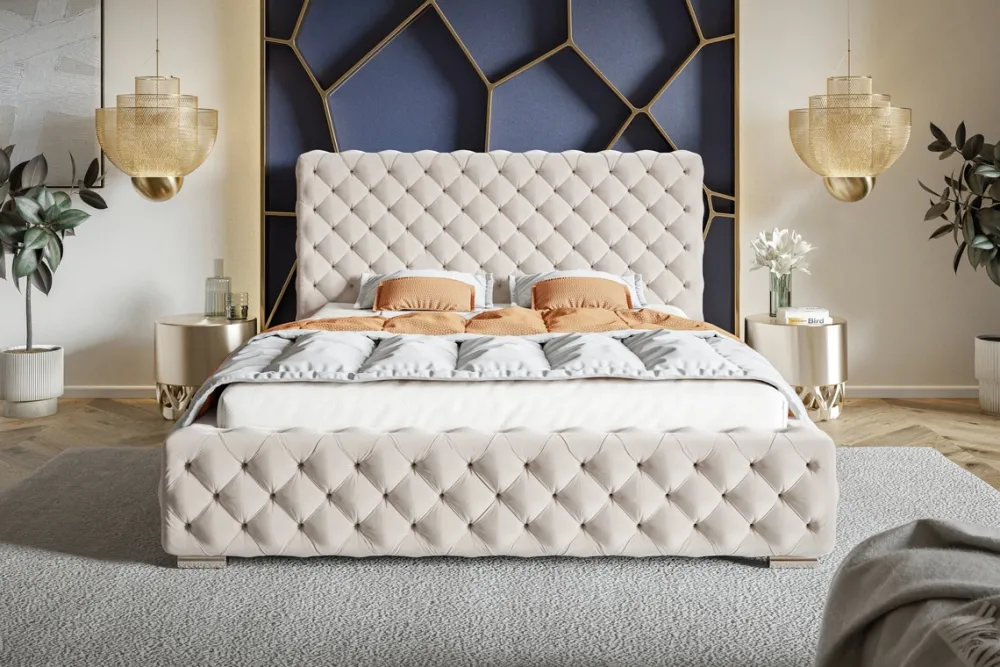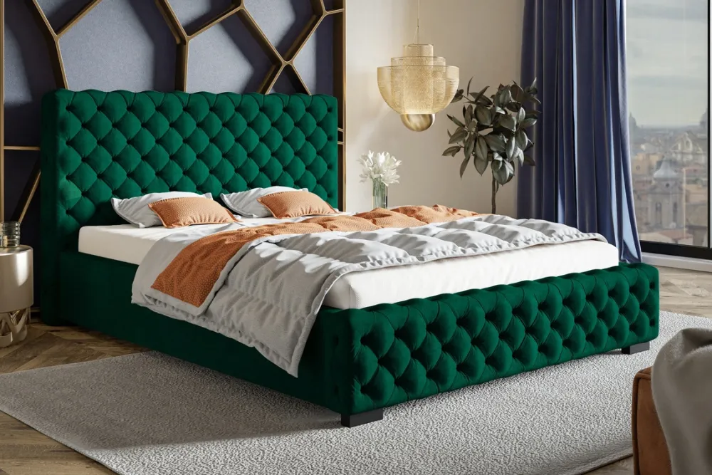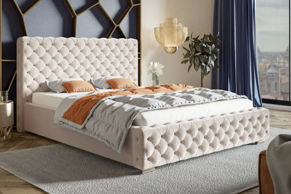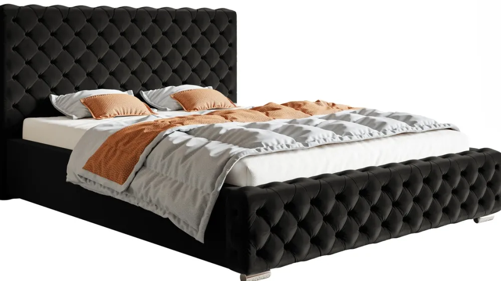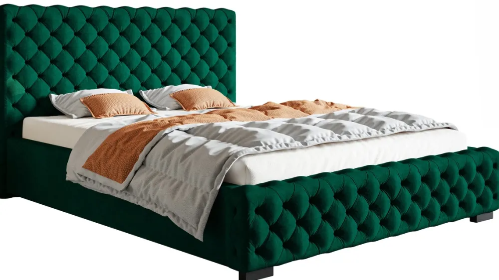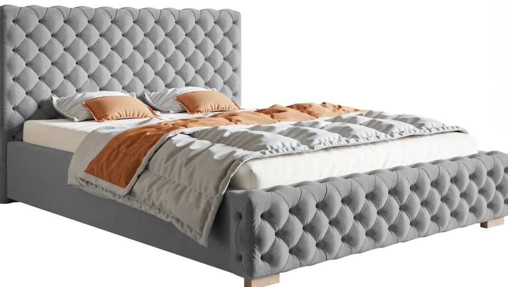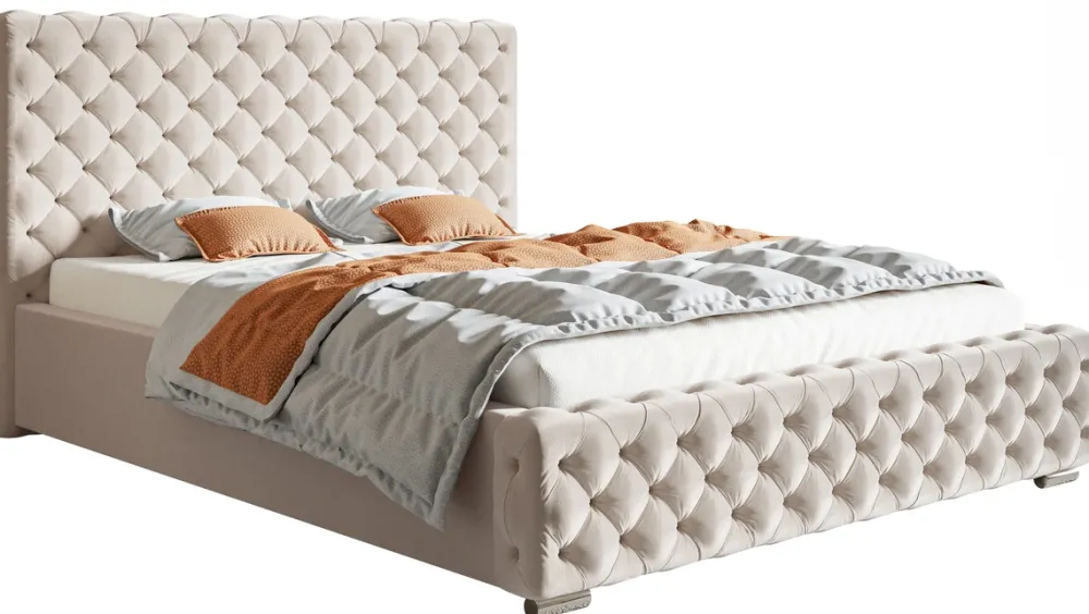 - Wygodne łoże do sypialni z pikowanym zagłówkiem i korpusem o powierzchni spania 200×200 cm. Wysokość zagłówka modyfikować w konfiguratorze obicie oparcia, czy kolor nóżek.