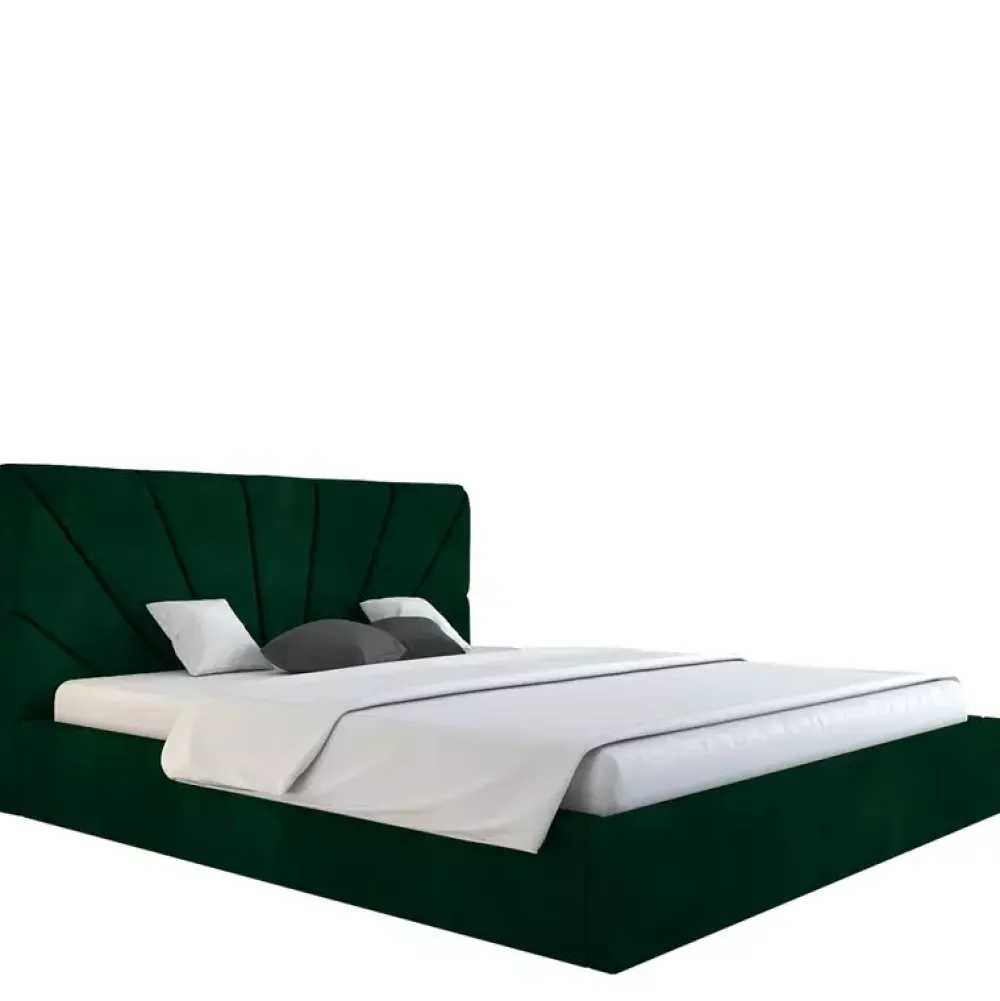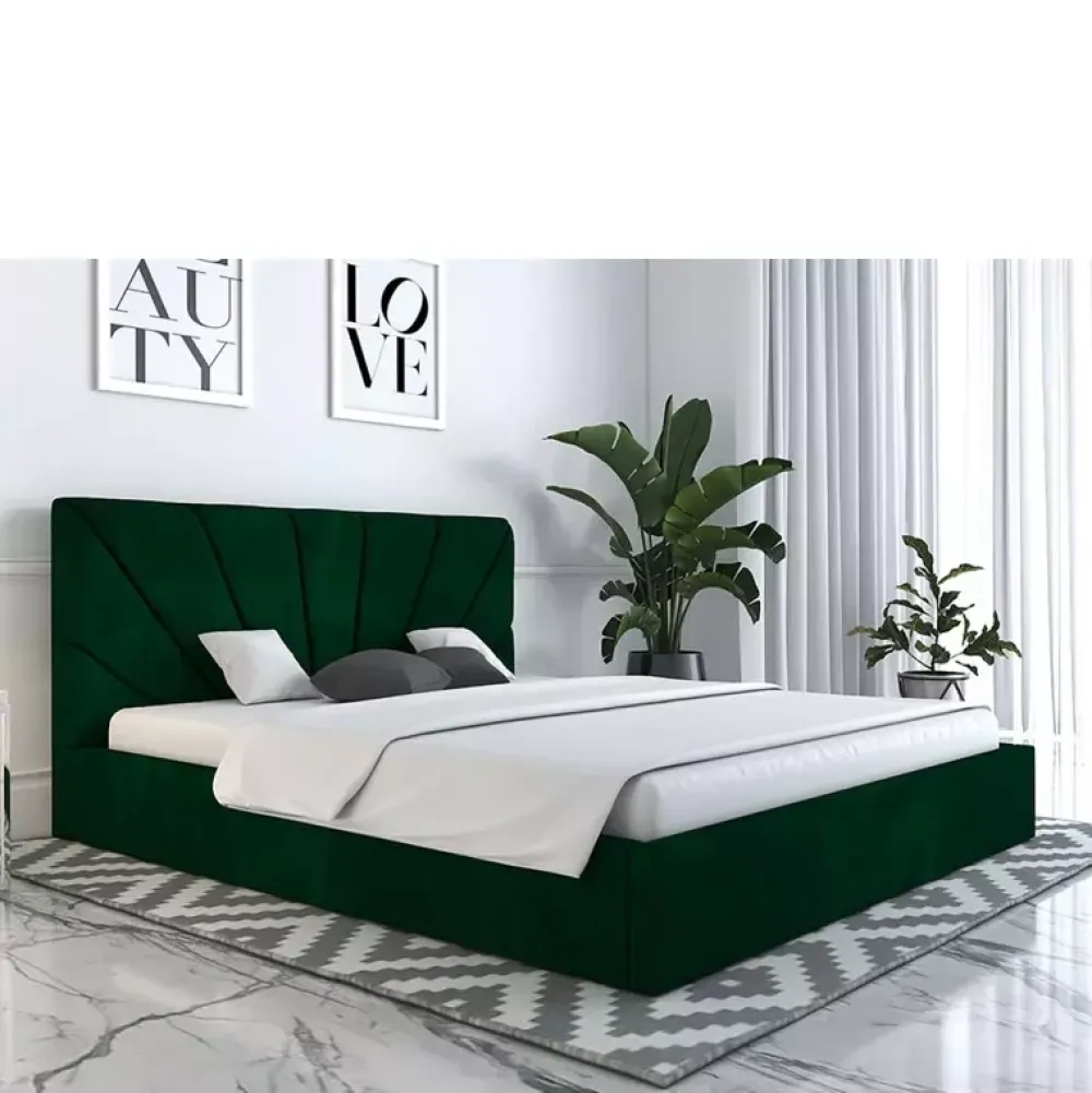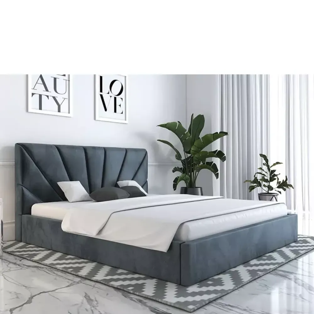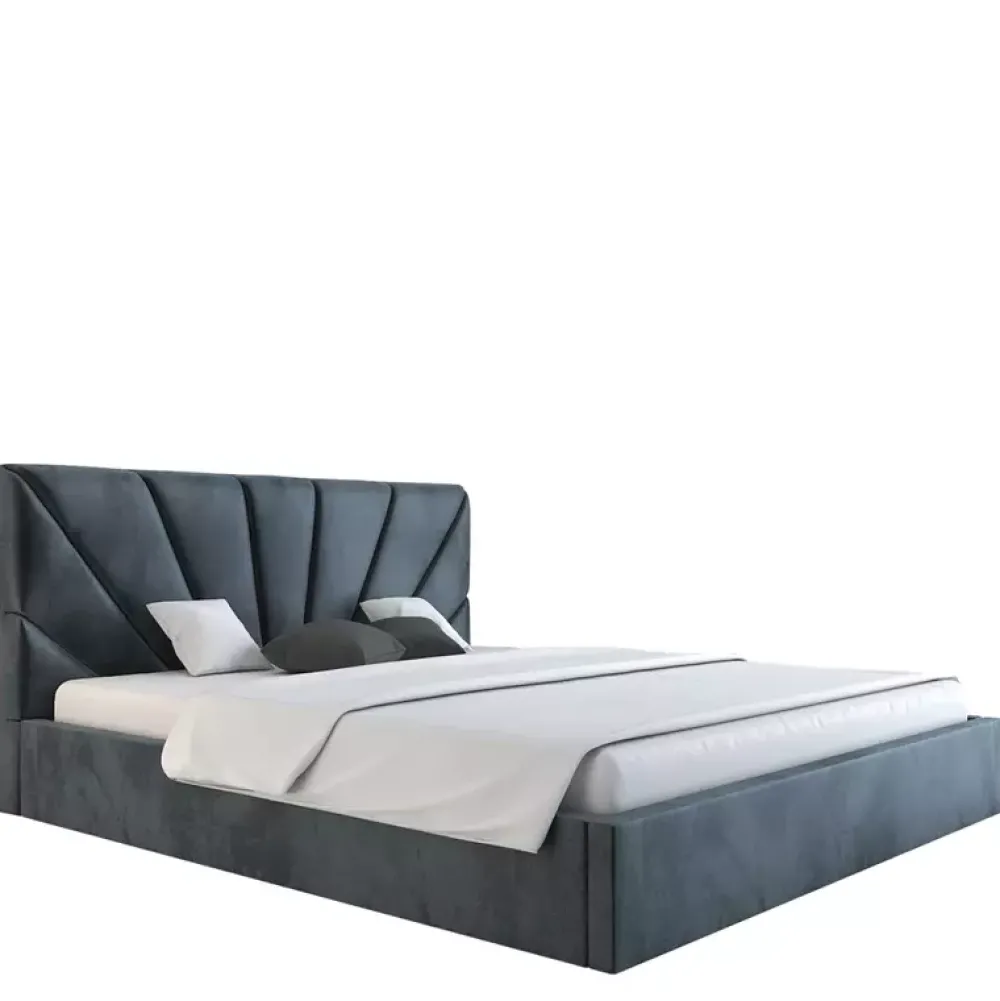 - Łóżko do sypialni zaaranżowanych w stylu nowoczesnym, oraz glamour, posiada miękki zagłówek, którego wysokość można dostosować w konfiguratorze, podobnie jak kolor i gatunek tkaniny obiciowej czy rodzaj stelaża na ramie drewnianej lub metalowej.