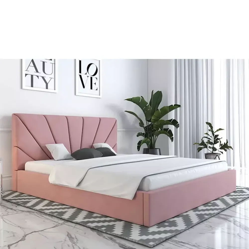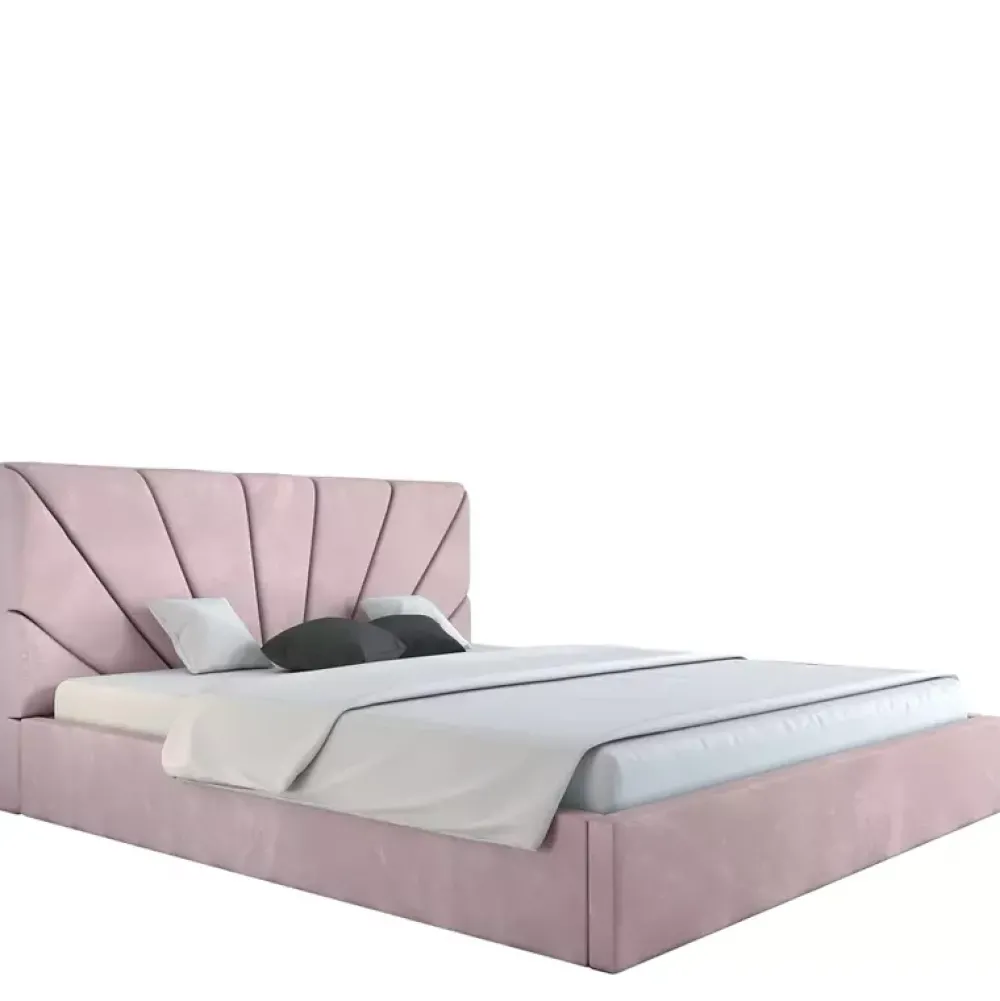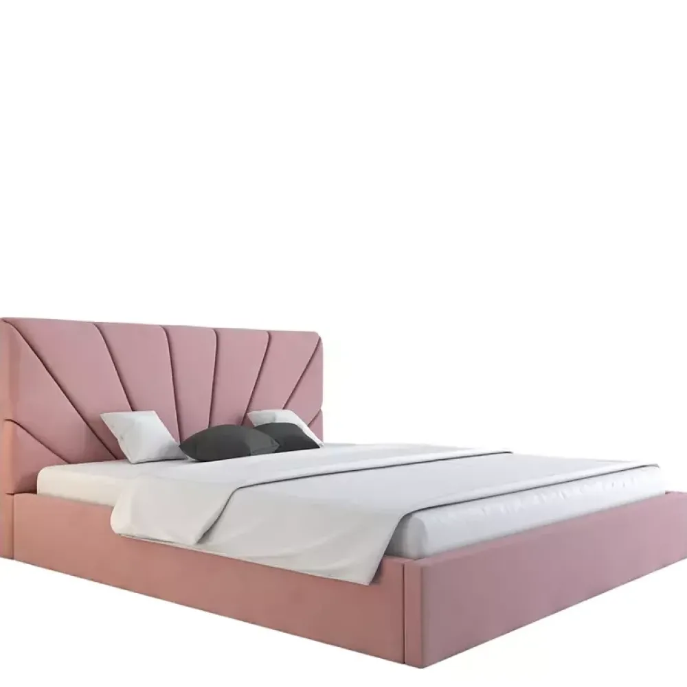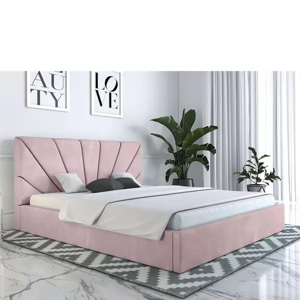 - Łóżko do sypialni zaaranżowanych w stylu nowoczesnym, oraz glamour, posiada miękki zagłówek, którego wysokość można dostosować w konfiguratorze, podobnie jak kolor i gatunek tkaniny obiciowej czy rodzaj stelaża na ramie drewnianej lub metalowej.