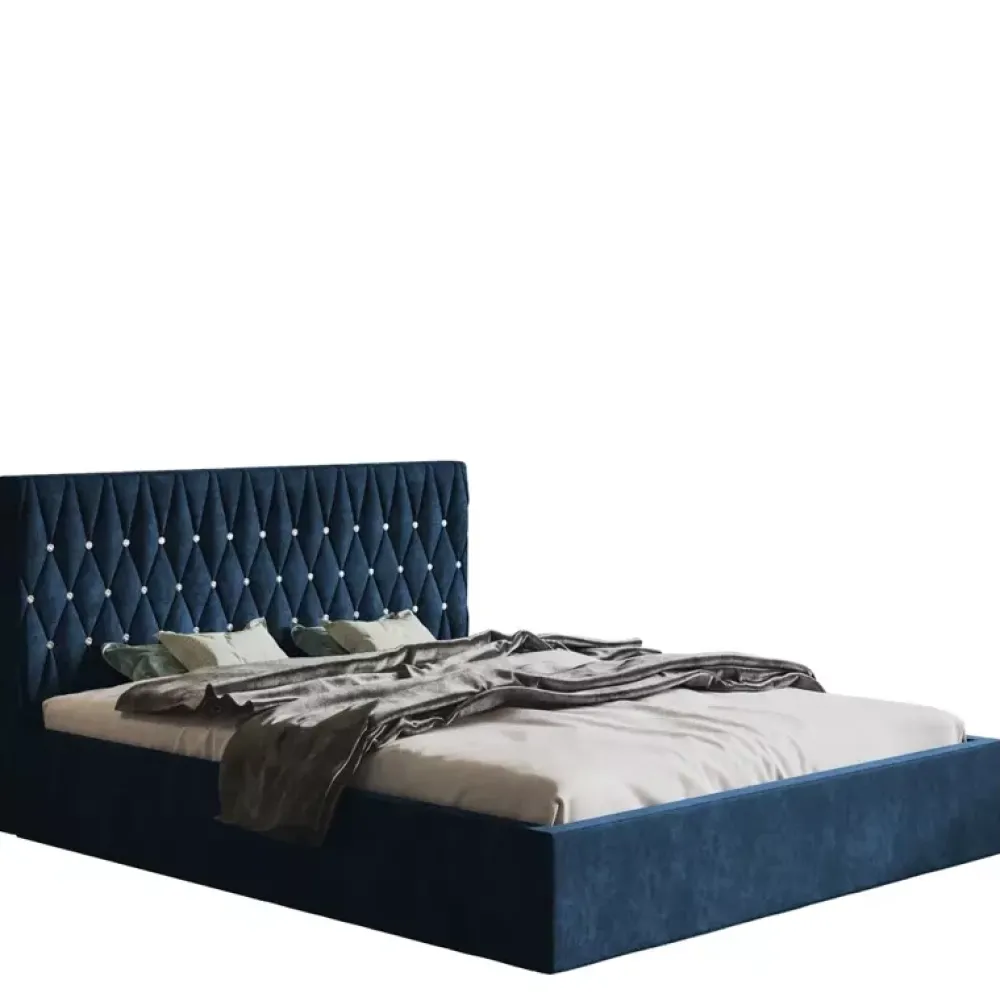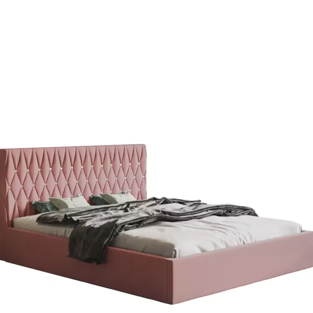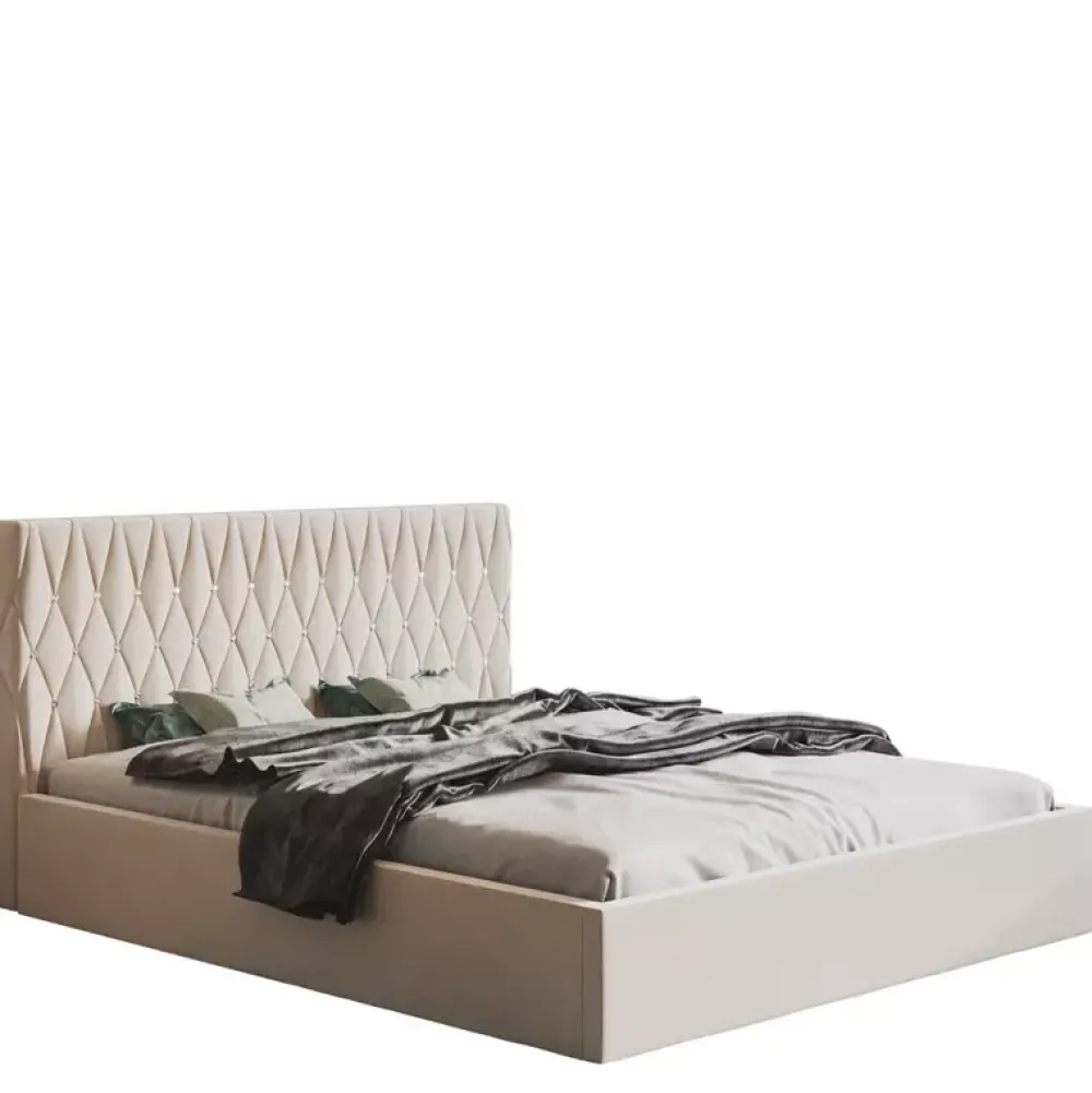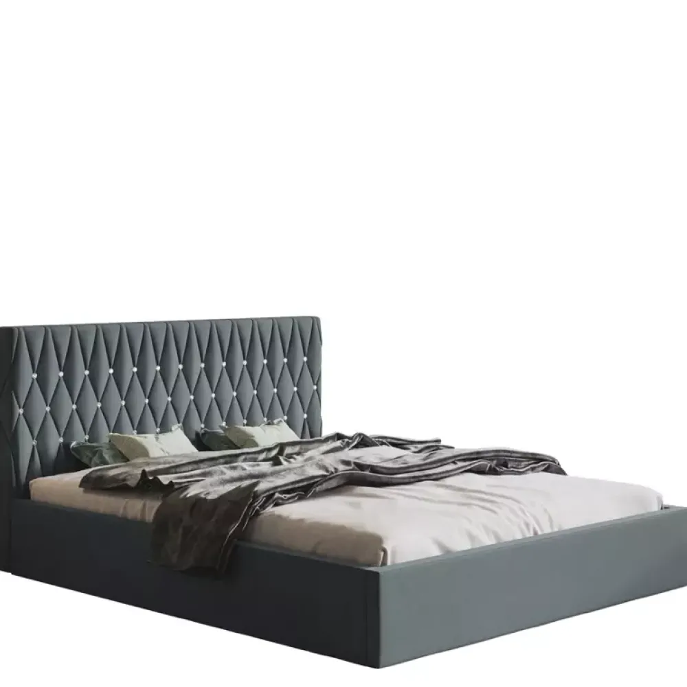 - Łóżko tapicerowane łączące ze sobą elementy wystroju stylu nowoczesnego oraz glamour. Wysoki miękki zagłówek z bogatym zdobieniem stworzonym z licznych przeszyć, oraz kryształków stwarza unikalną atmosferę, razem z solidną bryłą tworzy zwartą konstrukcję.