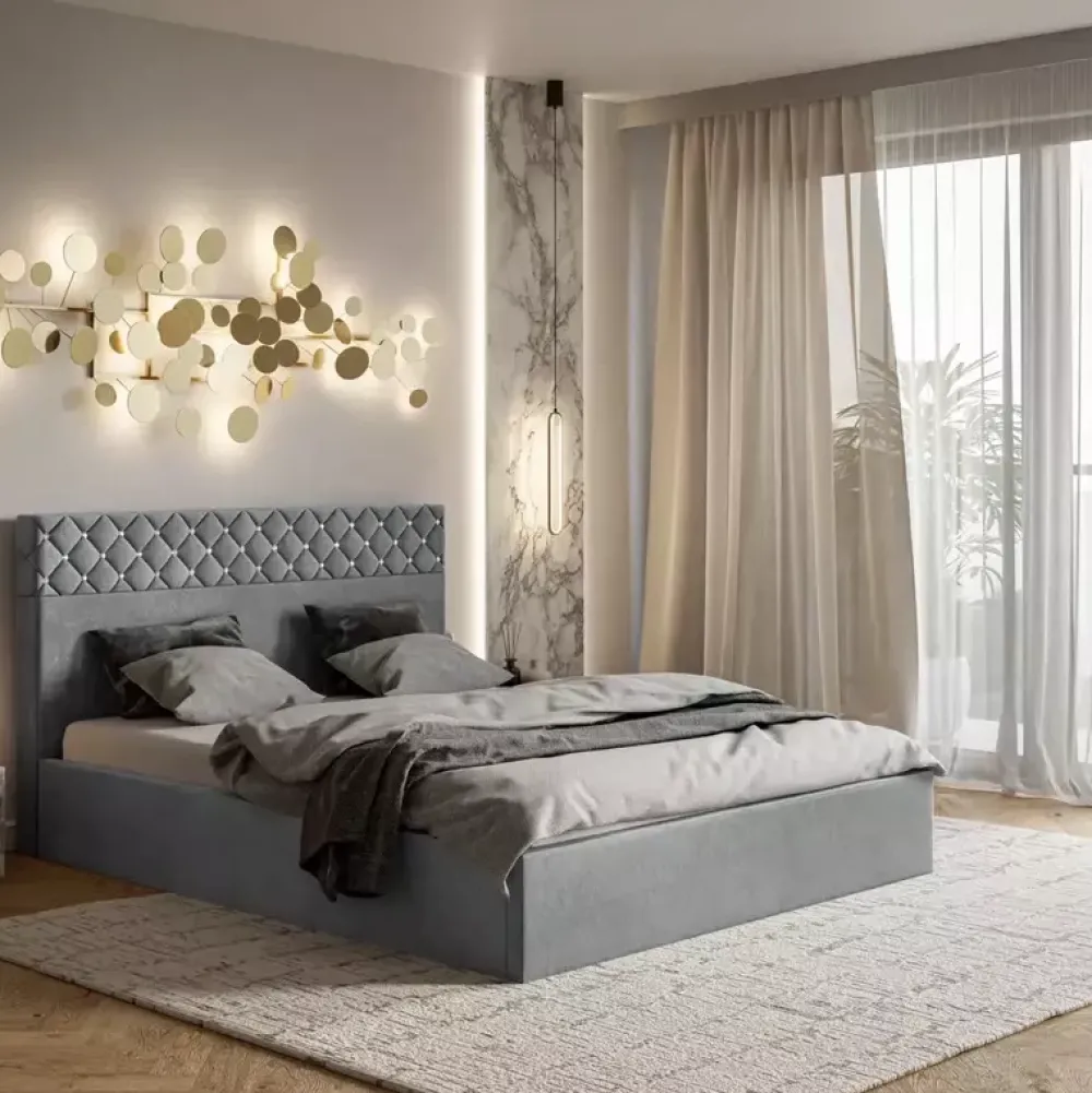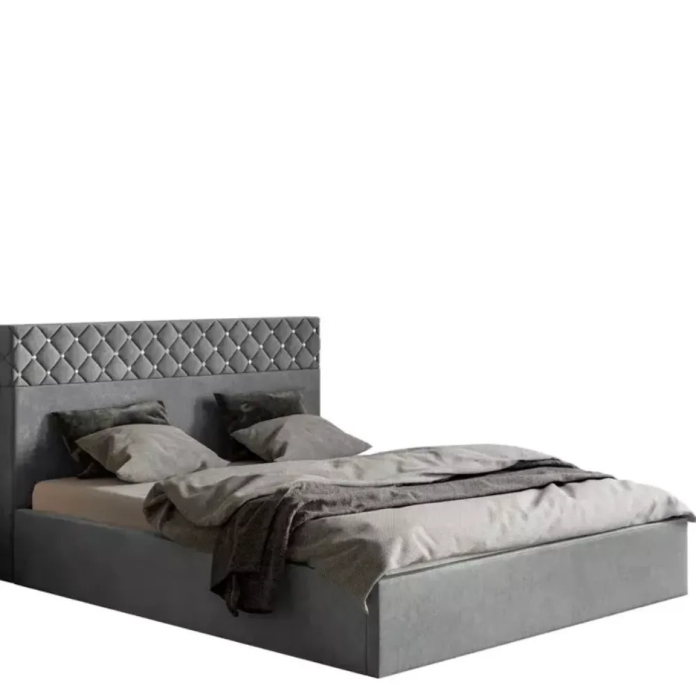 - Łóżko wyposażone w wysoki zagłówek tapicerowany, solidny stelaż, który w konfiguratorze można wymienić na metalowy unoszony na podnośnikach gazowych. Dostępne w kilkudziesięciu wariantach kolorystycznych tkanin tapicerskich różnych gatunków.