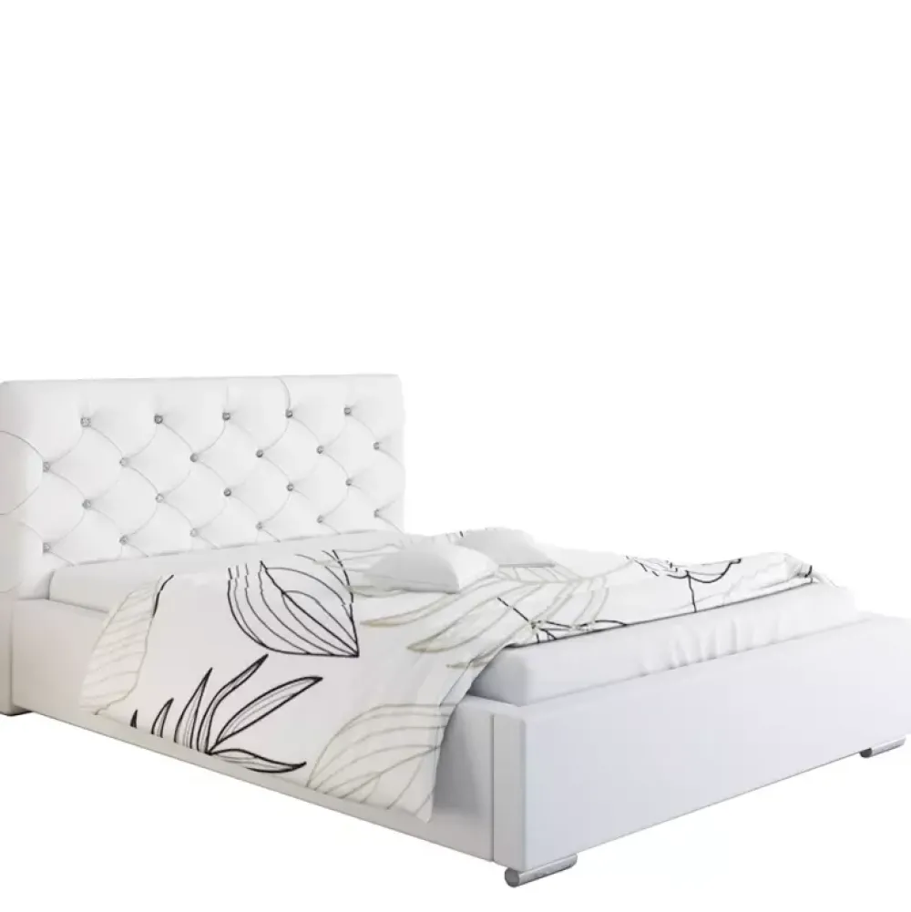 - Łóżko z wysokim zagłówkiem swoim zdobieniem nawiązującym do stylu glamour, wysokość zagłówka można zmodyfikować w konfiguratorze, tak samo jak kolor nóżek, rodzaj stelaża, a także obicie tylnej części oparcia.