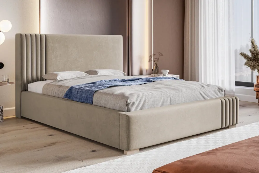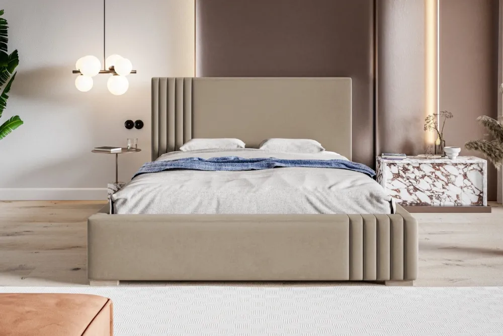 Zagłówek jest jednym z wyróżniających się elementów tego łóżka do sypialni. Przeszyty ozdobnym wzorem nie tylko dodaje estetyki, ale również zapewnia wygodne oparcie podczas czytania czy oglądania telewizji w łóżku.