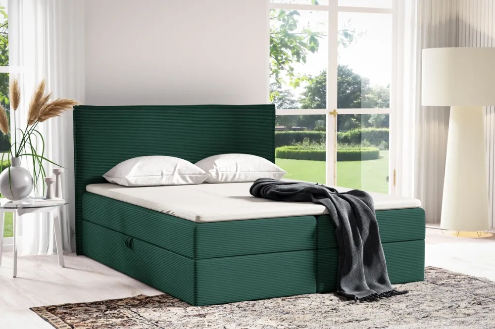 - Dwuosobowe łóżko kontynentalne MALIBU obite zostało miękką sztruksową tkaniną Poso. Łóżko posiada dwa przestronne pojemniki na pościel. Za komfortowy sen odpowiada materac ze sprężynami bonell. Łóżko kontynentalne można doposażyć w topper.