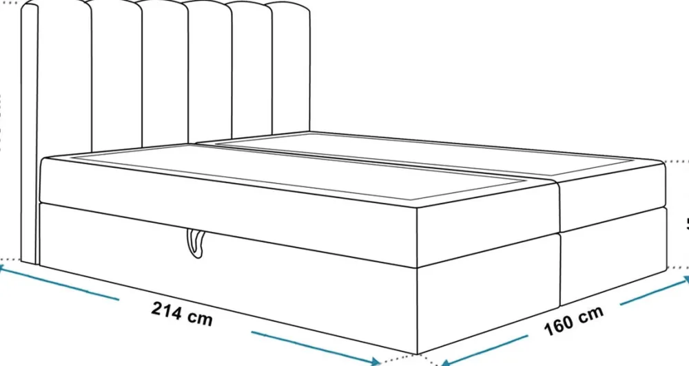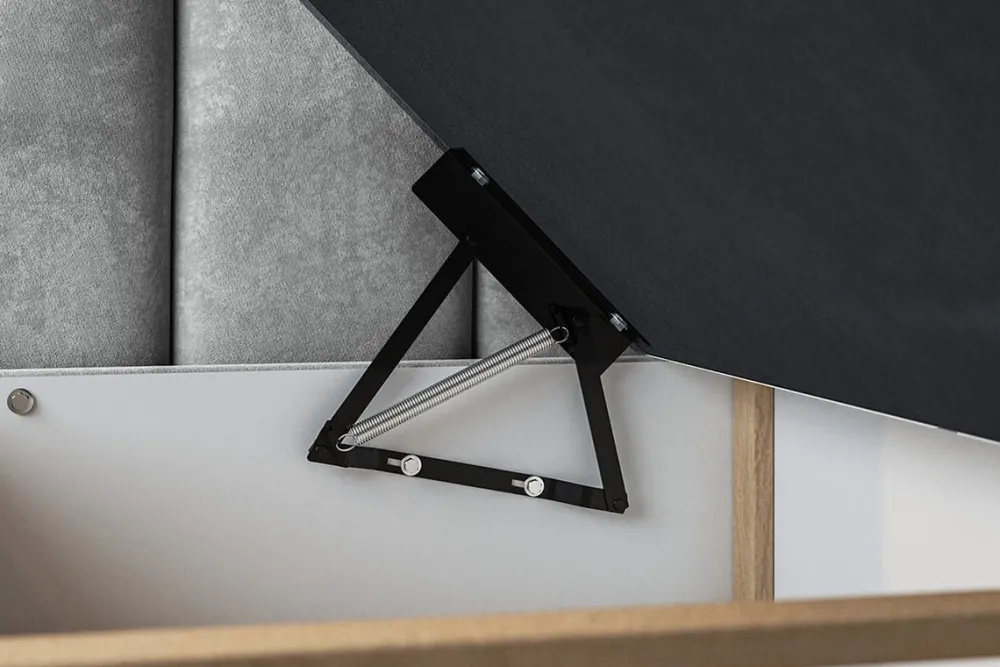 - Łóżko posiada pojemnik na pościel o wysokości 26 cm podzielony na dwie części, którego rozkładanie jest wspomagane za pomocą automatu sprężynowego.