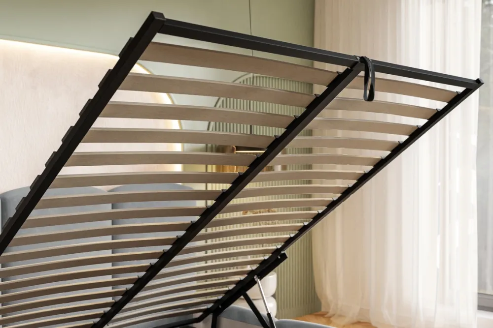 - Łóżko w standardzie wyposażone jest w drewniany stelaż składający się z 32 brzozowych listew, mocowanych w plastikowych uchwytach, stelaż w całości unoszony jest na podnośnikach sprężynowych. Rama stelaża wykonana jest ze sklejki. Rączka do podnoszenia wykonana jest w losowym kolorze, element niewidoczny po nałożeniu materaca. Poszczególne listewki oddalone są od siebie o około 5-5,5 cm. Maksymalne obciążenie stelaża to 200kg.
