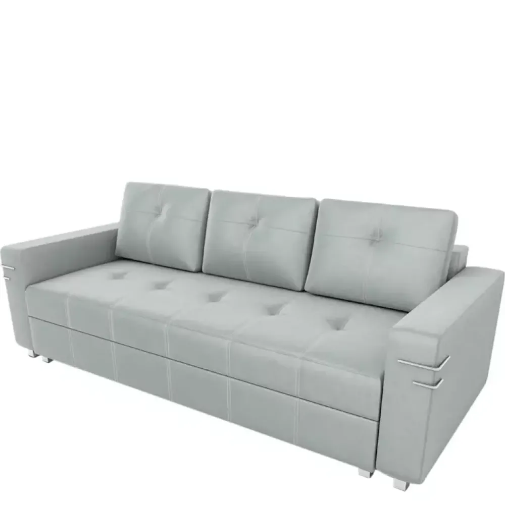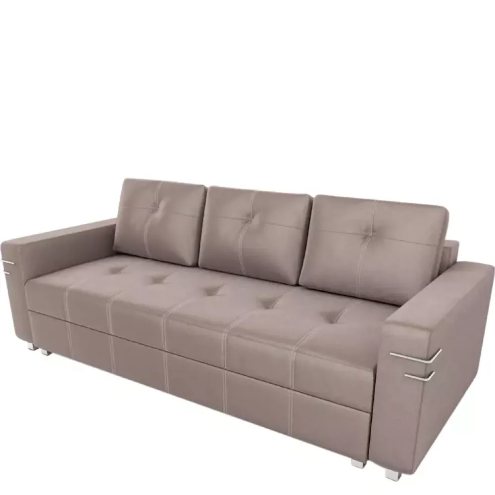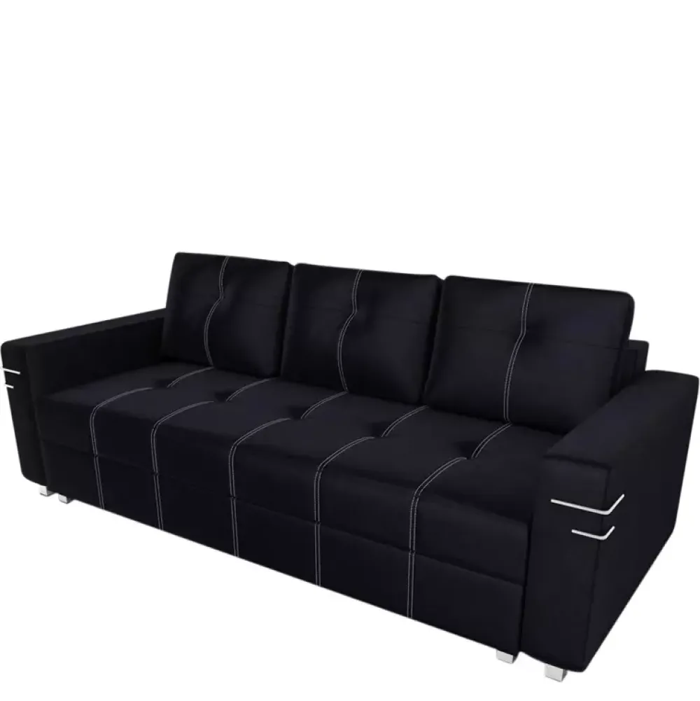 Sofa do pomieszczeń urządzonych w stylu nowoczesnym, wybór kilku wariantów kolorystycznych sprawia, że z łatwością znajdziecie coś pasującego do waszego salonu. Klasyczna bryła, symetryczne boczki pełniące rolę podłokietników, kontrastowe przeszycia białą nicią oraz wciągi na siedzisku, oraz poduszkach nadają mu intrygującego charakteru. Poza atutami wizualnymi nie sposób nie wspomnieć choćby o obszernej funkcji spania, automacie ułatwiającym rozkładanie czy dużym pojemniku na pościel pod siedziskiem.