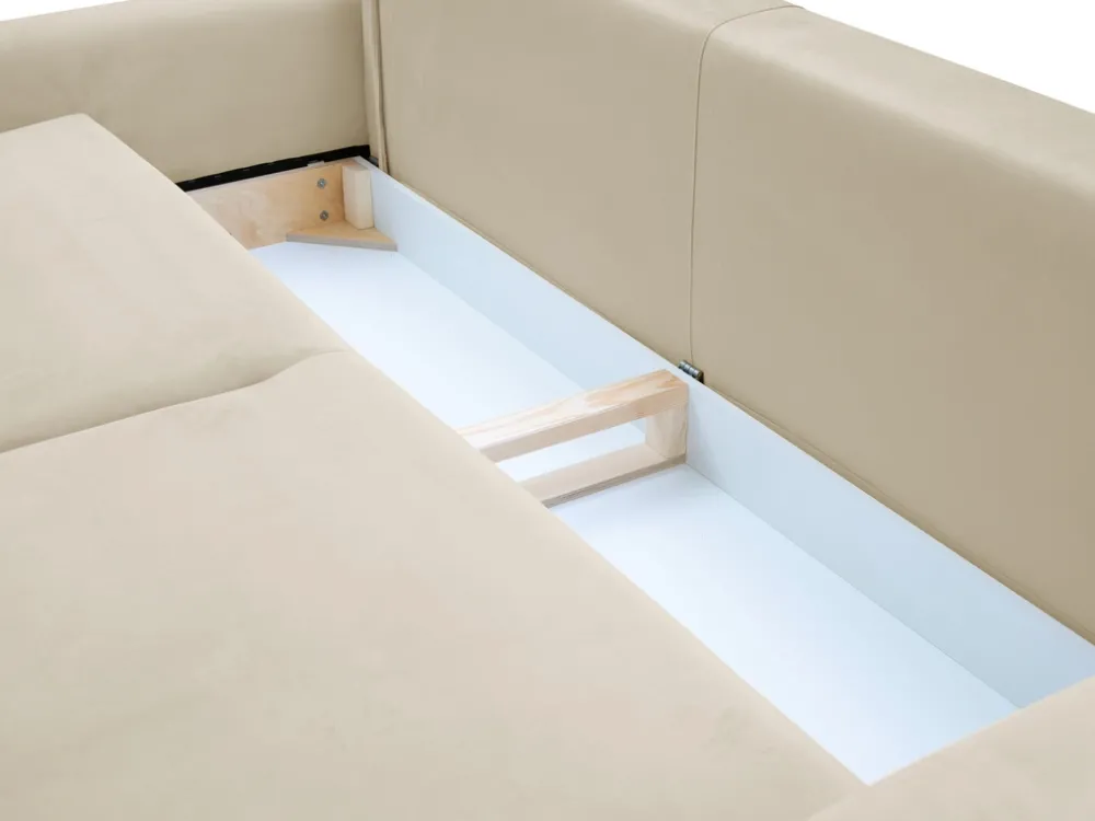 Pod siedziskiem znajdziesz pojemnik na pościel – idealny na koce, poduszki czy inne niezbędne akcesoria. Dzięki temu Twój salon pozostanie zawsze uporządkowany.