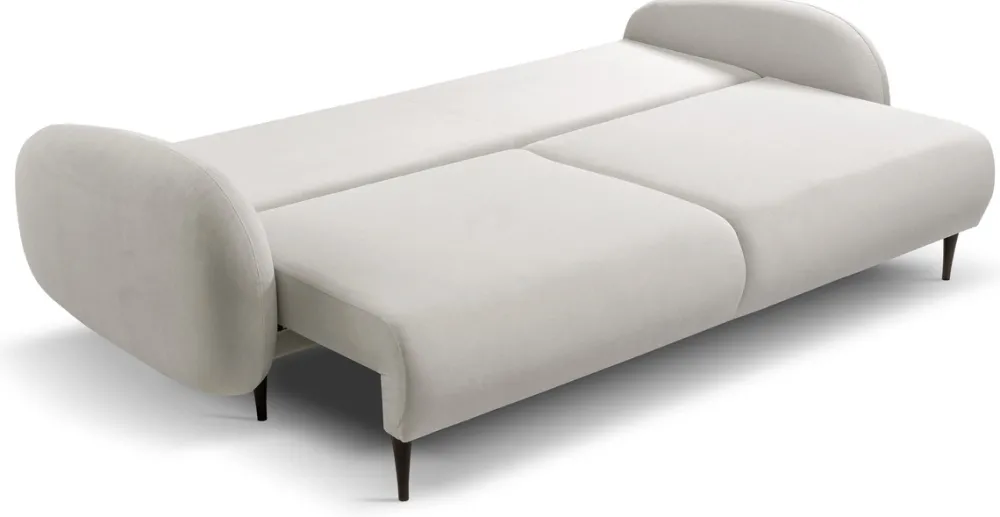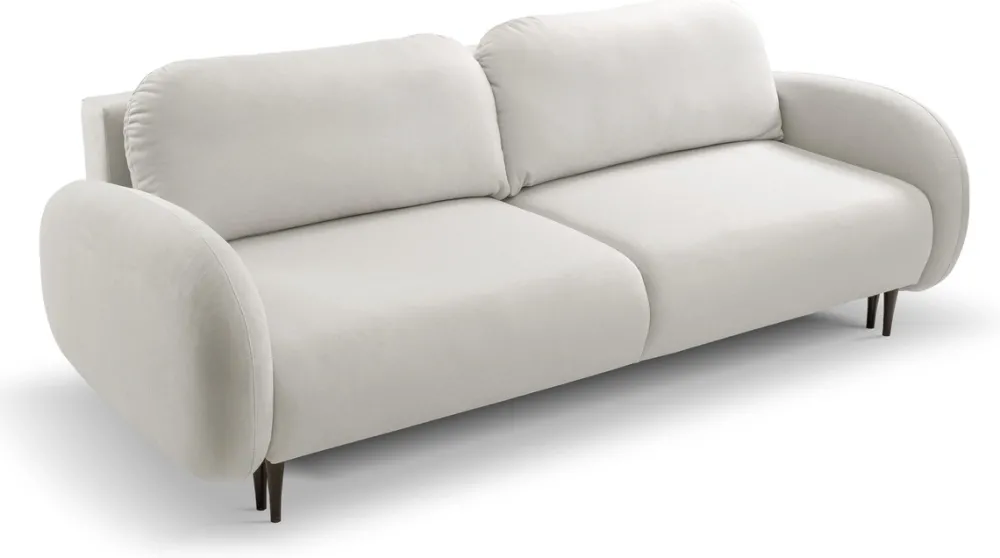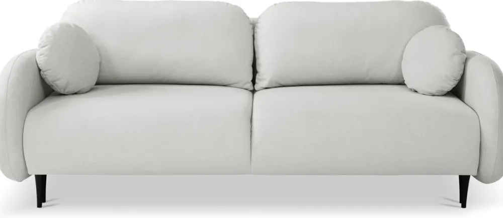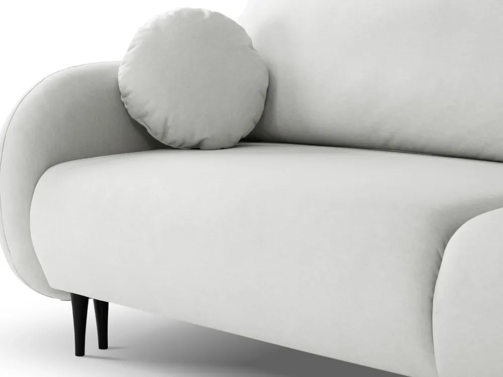 - Sofa z funkcją spania SONIC posiada dwie grube poduchy oparciowe oraz dwie mniejsze okrągłe poduszki. Siedzisko sofy zostało wykonane na bazie sprężyn falistych oraz pianki PUR. Pod siedziskiem znajduje się pojemnik na pościel. Funkcja spania 140×200 cm.