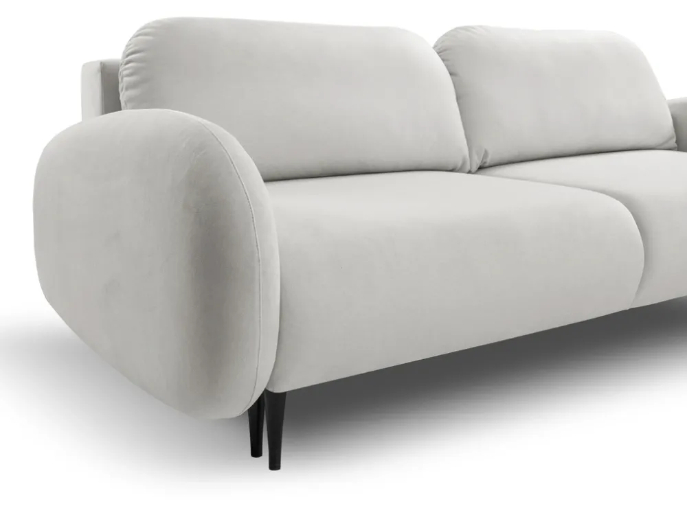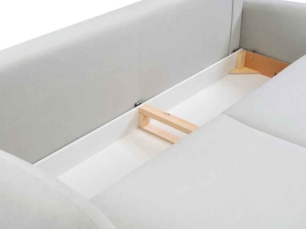 Sofa wyposażona jest w pojemnik na pościel, który zapewnia dodatkową przestrzeń do przechowywania, umożliwiając łatwe i szybkie schowanie pościeli, koców czy innych akcesoriów. Dzięki temu rozwiązaniu, Twoja przestrzeń życiowa pozostaje zorganizowana i wolna od bałaganu.
