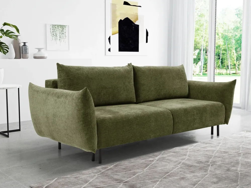 Sofa z funkcją spania wyróżnia się nowoczesnym designem, który harmonijnie współgra z różnorodnymi aranżacjami wnętrz. Starannie dobrane linie i formy podkreślają jej unikatowy charakter, czyniąc ją centralnym punktem każdego salonu.