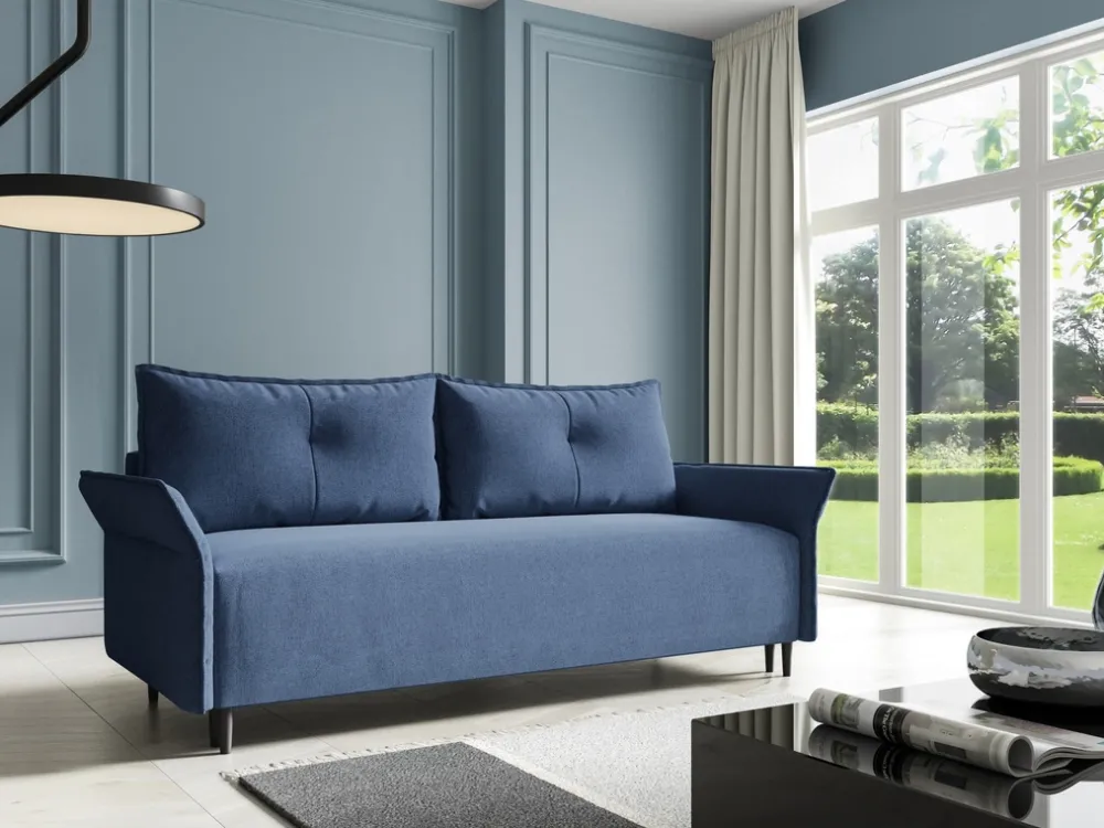 - Rozkładana kanapa posiada tapicerowane plecy, co oznacza, że można ustawić mebel nawet pośrodku salonu.