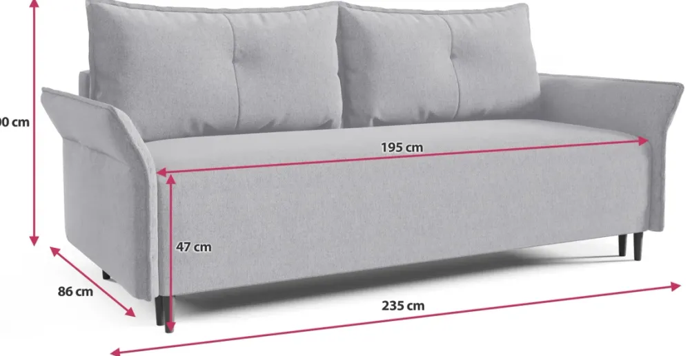 Nasza kanapa ma imponujące wymiary – szerokość wynosi 235 cm, wysokość 100 cm, a głębokość 87 cm, co sprawia, że jest ona zarówno przestronna, jak i wygodna dla każdego użytkownika. Taki rozmiar pozwala na komfortowe siedzenie, nawet podczas długotrwałego użytkowania, oferując jednocześnie dużo miejsca dla rodziny czy przyjaciół. Prosta, a zarazem elegancka linia kanapy doskonale wpisuje się w każdy styl wnętrza, od klasycznego po współczesny.