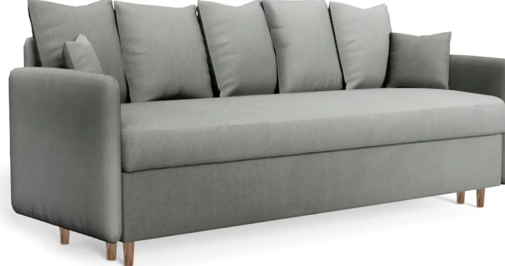 - Sofa z funkcją spania GRATO to funkcjonalny mebel wyposażony w komplet miękkich poduch oparciowych, wygodne siedzisko ze sprężynami bonell oraz głęboki pojemnik na pościel. Nóżki sofy wykonane zostały z drewna bukowego.