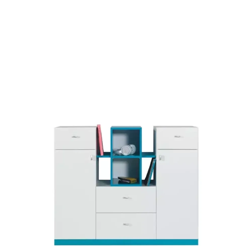 - Komoda z kolekcji MALVES posiada nowoczesną bryłę, która pozytywnie zaskakuje zarówno swoją stylistyką, jak i praktycznymi aspektami. Komoda została wyposażona we dwoje drzwi, za każdymi znajduje się półka, dodatkowo nie zabrakło dwóch szuflad.