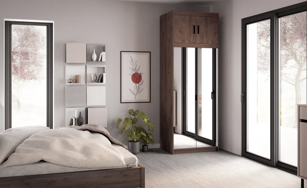 - Dwudrzwiowa szafa z lustrem – elegancki front z lustrzaną taflą rozświetla i powiększa wnętrze