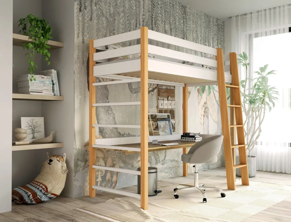 Pod powierzchnią spania znajduje się praktyczne biurko, które idealnie sprawdzi się jako miejsce do nauki, pracy lub zabawy. W ten sposób każda przestrzeń jest efektywnie wykorzystana, co czyni to łóżko na antresoli doskonałym wyborem dla osób ceniących ergonomię i funkcjonalność w aranżacji wnętrz.
