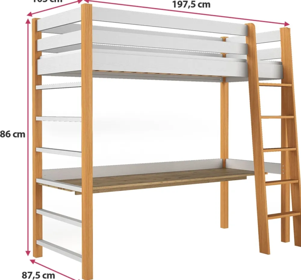 - Łóżko na antresoli NAVIS posiada stelaż listwowy z miejscem na materac o powierzchni 80×190 cm. Pod łóżkiem znajduje się blat na komputer lub laptop, który pozwala zaoszczędzić znaczną ilość miejsca w pomieszczeniu. Solidne barierki boczne.