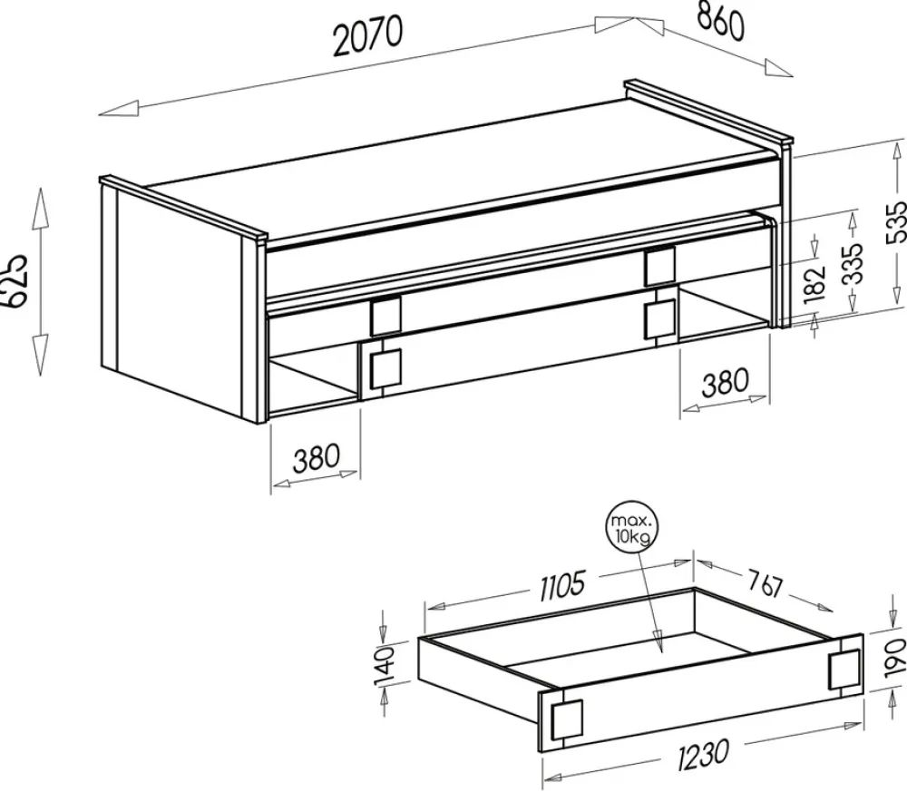 Łóżko ma wymiary 86 cm szerokości, 207 cm długości i 62,5 cm wysokości, co zapewnia odpowiednią przestrzeń do spania przy zachowaniu kompaktowych rozmiarów idealnych do mniejszych pokoi. Górna część oferuje pełnowymiarowe miejsce do spania o wymiarach 80 × 200 cm, natomiast dolna, wysuwana część, dysponuje nieco mniejszą powierzchnią spania – 80 × 195 cm, co pozwala na łatwe dostosowanie do indywidualnych potrzeb użytkownika i optymalne wykorzystanie dostępnej przestrzeni.