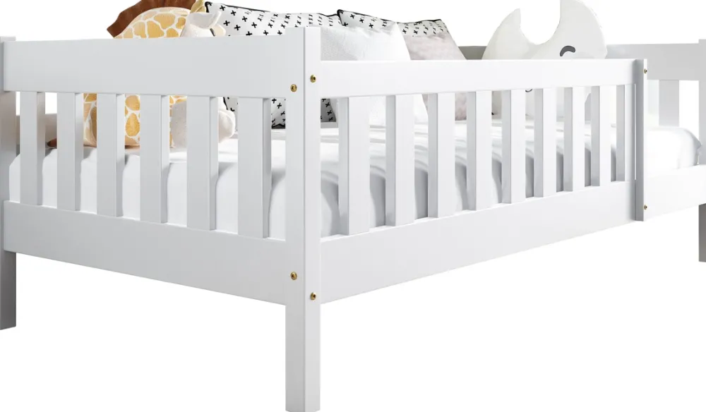 - Łóżko dziecięce wykonane z drewna sosnowego. Drewno sosnowe jest cenione za swoją trwałość i solidność, co gwarantuje, że łóżko posłuży przez wiele lat. Ten wariant występuję w wybarwieniu białym.