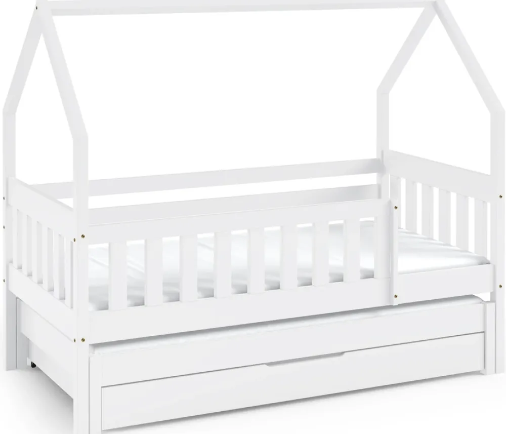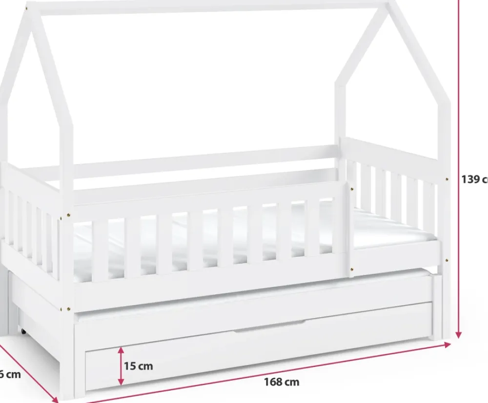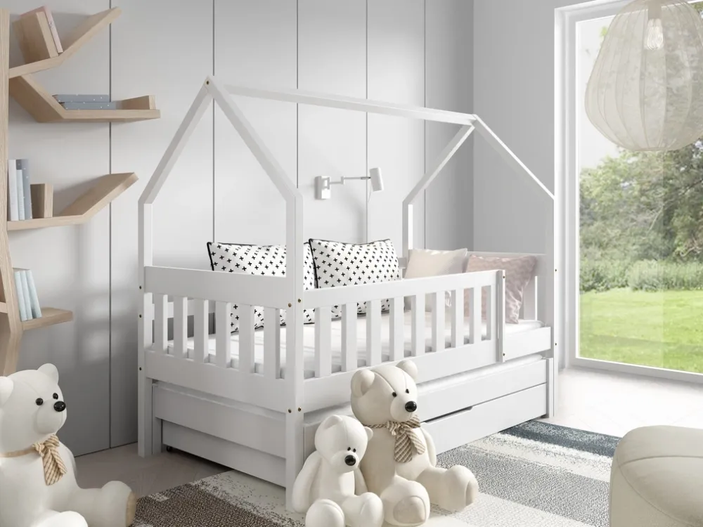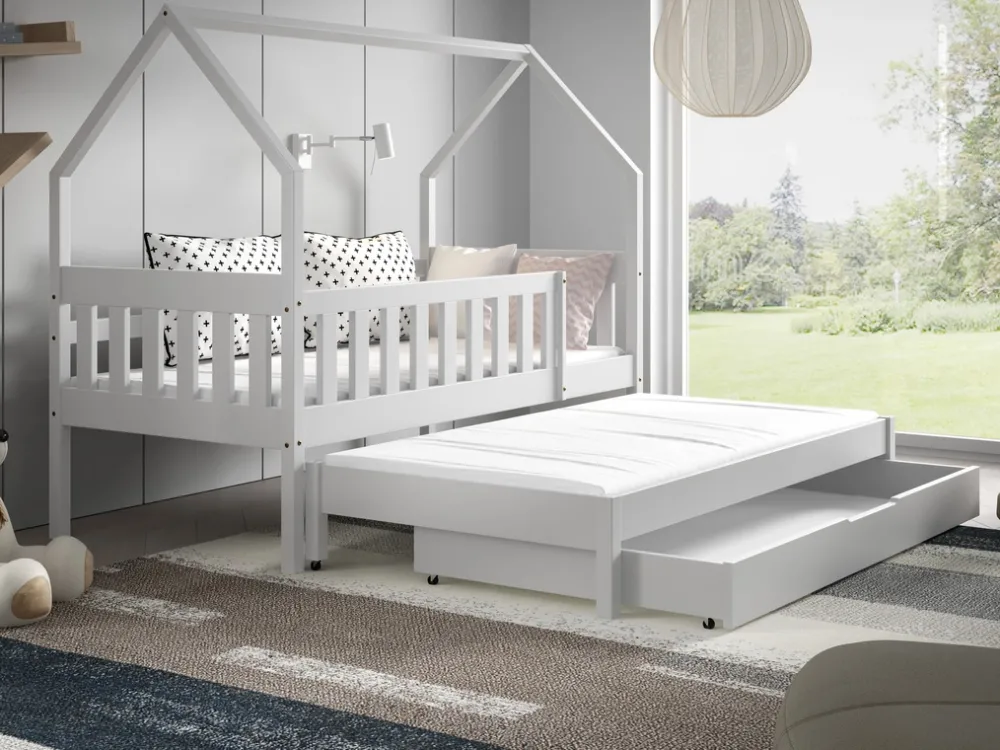 - Nowoczesne łóżko domek MELANIA, wykonane z drewna sosnowego w wybarwieniu białym. Posiada dwie powierzchnie spania wynoszące odpowiednio 80×160 oraz 80×150 cm. Umożliwia montaż prawo lub lewostronny. Pod łóżkiem znajdziemy pojemną szufladę na pościel.