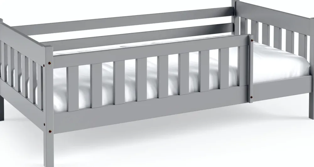 - Łóżko dziecięce wykonane z drewna sosnowego. Drewno sosnowe jest cenione za swoją trwałość i solidność, co gwarantuje, że łóżko posłuży przez wiele lat. Ten wariant występuję w wybarwieniu szarym.